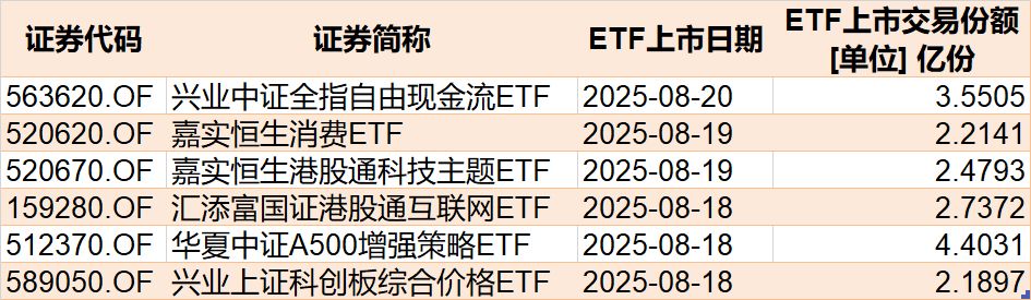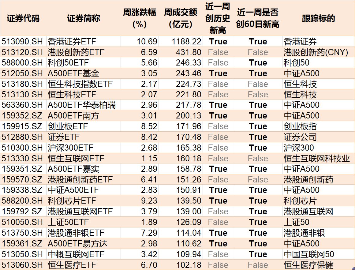 其中,香港证券ETF周成交额超1100亿元,港股创新药ETF周成交额超400亿元。 有机构表示,2025年市场交投维持高位,叠加权益市场上行带来的基本面修复,是券商板块上涨的核心驱动因素,并购重组主线新进展也是板块重要催化。在流动性适度宽松环境延续、资本市场环境持续优化、投资者信心重塑等多方面因素共同推动下,证券板块景气度上行,中长期资金扩容预期进一步增强基本面改善预期。 6只ETF下周上市 基金重仓股向来是投资者关注的热点,但是主动管理型基金的重仓股浮出水面,通常都有一定的滞后性,而ETF布局的标的却是非常明确的,通过跟踪新上市ETF,通常可以发现近期热点个股,新上市ETF带来的增量资金也值得关注。 目前有6只ETF披露下周上市,跟踪标的为科创板综合、中证A500增强、港股通互联网、港股通科技、恒生消费、自由现金流等。