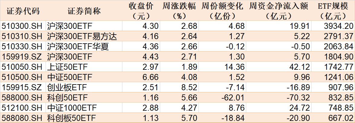 本周主要指数相关ETF表现 本周市场主要股指集体上涨,规模较大的ETF中,创业板ETF涨超8%。 Wind数据显示,上述10只指数ETF本周合计净流出0.98亿元,其中科创50ETF净流出70.32亿元。 总体而言,本周沪深两市股票型ETF和跨境型ETF合计净流出约50亿元。 有券商表示,考虑到美联储降息预期提升,外部流动性及风险偏好将出现回升过程,这将对A股的流动性环境有外溢性影响。而更重要的是,国内流动性仍呈现相对温和的自我强化特征,在市场不出现加速赶顶或其他明显流动性拐点信号前,行情中期或维持温和上涨趋势,这也将有利于流动性正向循环的形成。 煤炭、医疗器械、机器人等ETF净流入资金居前 在行业主题ETF方面,本周净流入资金超1亿元的基金有27只,其中煤炭ETF、通信ETF和医疗器械ETF分别增加了12.62亿份、5.21亿份和13.21亿份,净流入资金13.83亿元、9.96亿元和7.16亿元。