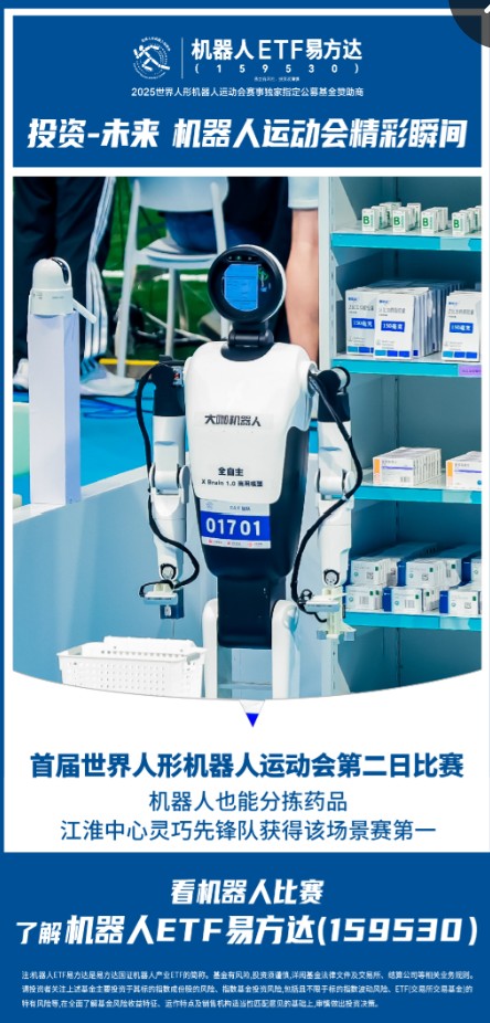 2025世界人形机器人运动会火热进行中,本届赛事创新设置了场景赛单元,共包括工业场景、医药场景、酒店场景、仓储场景四个类别,旨在考验机器人在真实应用中的综合能力。医药场景中,双臂机器人利用头部的深度相机,精准捕获到桌面上药板、药盒的位置和姿态,然后将药板中的药片全部压到药盒中,实现药品拆装,赢得观众的阵阵掌声。 据了解,作为这场科技盛会的唯一公募基金官方赞助商,机器人ETF易方达(159530)将深度融入赛事,为这场前所未有的竞技盛宴注入金融动能。该ETF跟踪的国证机器人产业指数中,人形机器人相关个股占比近八成,“人形含量”在ETF跟踪的指数中居首。Wind数据显示,机器人ETF易方达(159530)连续多日获净流入,产品规模达47.5亿元,创历史新高。 智能技术提升医药场景工作效率,医药产业投资机遇同样值得关注。医药ETF(512010)标的指数聚焦A股医药卫生行业龙头,可助力投资者捕捉医药领域智能化发展机遇。