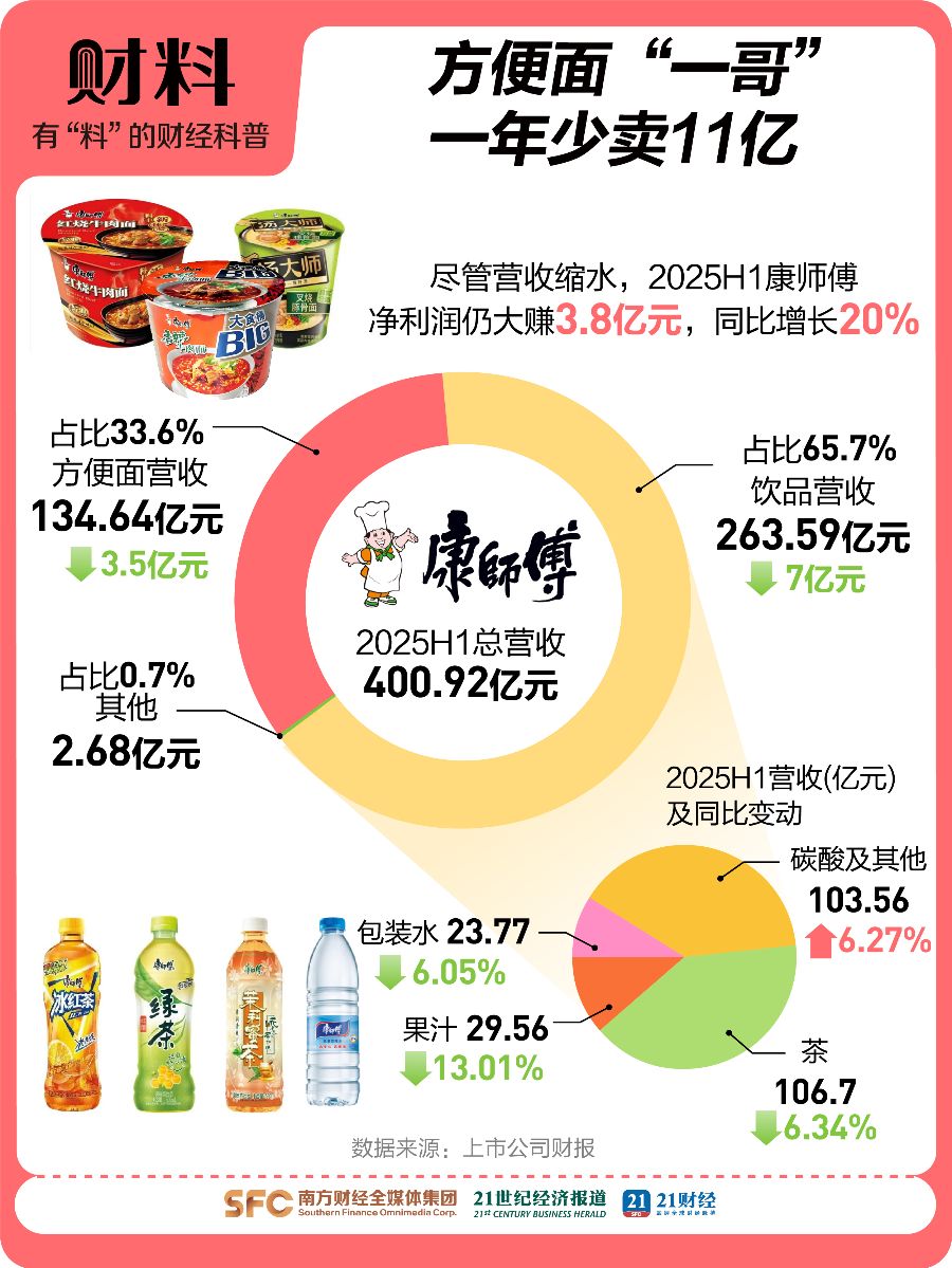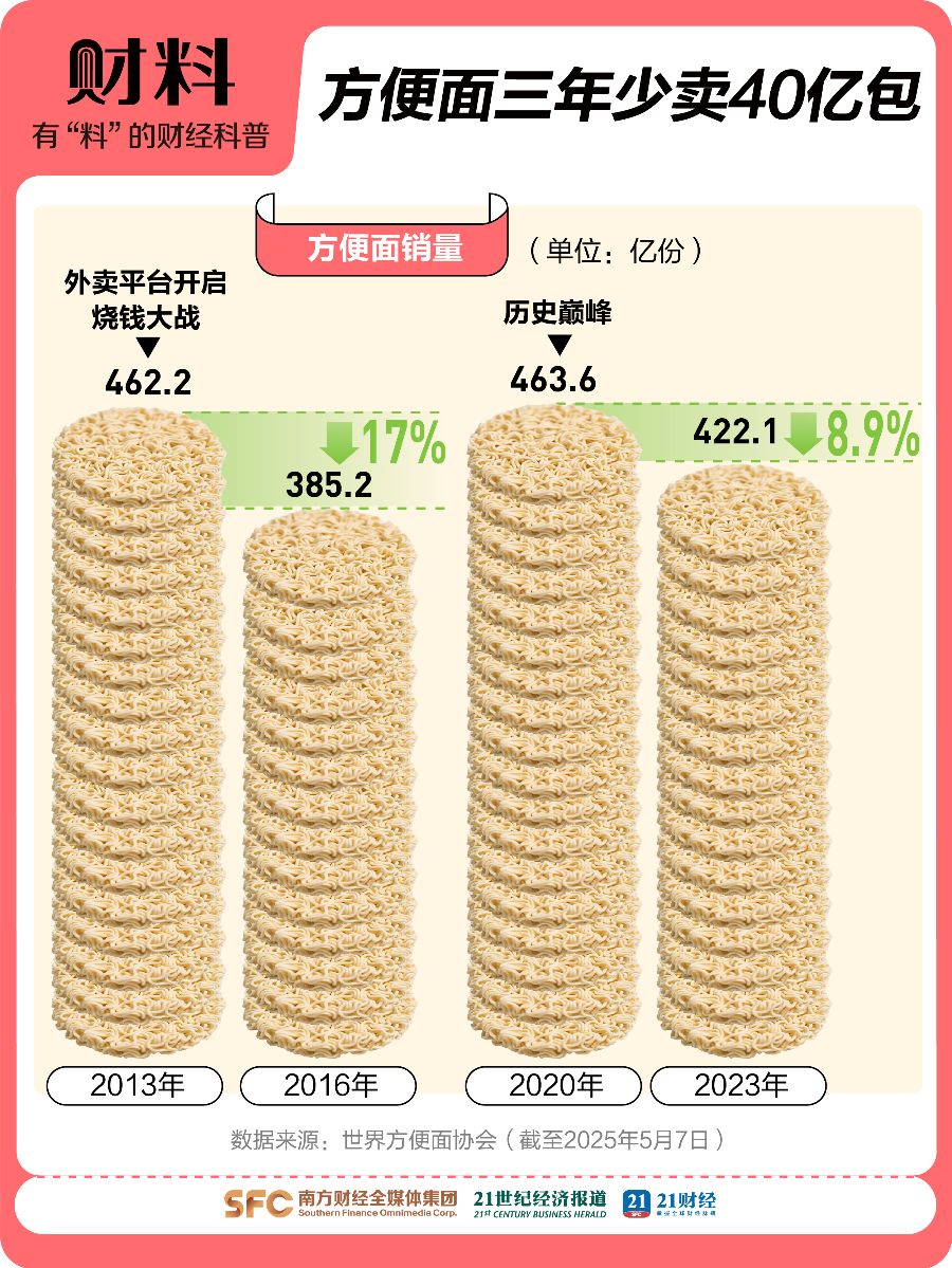 曾被中国人一年被吃掉超438亿包的方便面,如今正以肉眼可见的速度退热。 《21财料》观察到,据世界方便面协会数据统计,2020—2023年,方便面3年消费量减少40亿包,2024年方便面消费量跌至438亿包,2025年Q2 ...