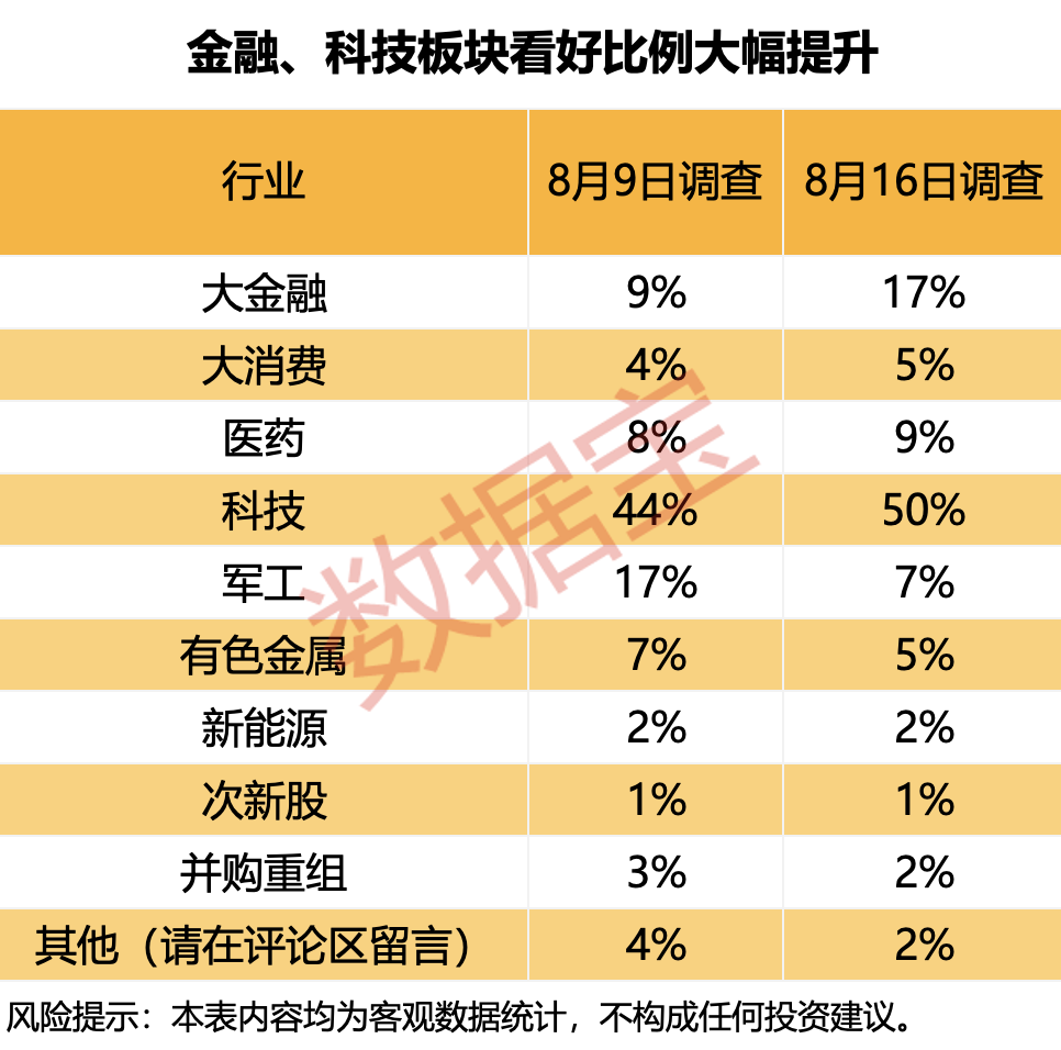 本周(8月11日至15日),A股市场单边上行,成交规模持续放大,连续5日在1.8万亿元以上,其中3日突破2万亿元。 指数方面,周内沪指一度站上3700点关口,最新报3696.77点,周涨幅1.7%;深证成指上涨4.55%,创业板指大幅上涨8.58%。 ![]() 申万行业指数普遍收涨。其中,通信、电子指数均涨逾7%;非银金融指数涨逾6%;电力设备、计算机指数均涨逾5%。 下跌方面,纺织服饰、钢铁、银行指数均跌逾1%。银行跌幅最高,为3.19%。 资金流向方面,本周主力资金净流出702.19亿元。其中,机械设备、国防军工板块净流出额均逾100亿元,分别为136.69亿元、125.18亿元;有色金属、传媒板块净流出额在70亿元以上。非银金融、银行、家用电器、公用事业板块主力资金净流入额均超亿元,依次为120.38亿元、19.97亿元、6.09亿元、1.51亿元。 86%的受访者表示本周“赚到了钱” 8月16日,数据宝推出了一份《下周3700点“攻防战”,怎么看?》的小调查,感谢各位粉丝的热情投票与支持。 从仓位变化来看,本周25%的受访者进行了“加仓”;25%的受访者进行了“减仓”;4%的受访者进行了“清仓”操作;其余46%持仓不动。 从仓位管理来看,选择“50%~100%”以及“50%以下”受访者占比分别上升了4个百分点、1个百分点,最新依次为39%、17%;“满仓”和“空仓”的仓位则有所下降,最新分别为31%、4%。“满仓加融资”则与上周持平。 ![]() 从盈亏情况来看,本周A股赚钱效应较好,约有86%的受访者表示“赚到了钱”。其中,69%属于“盈利10%以内”;“盈利10%以上”的占比17%。 “亏损10%以内”的受访者占比10%,“亏损10%以上”的占比约为5%。 五成受访者认为下周A股将站稳3700点 对于当前A股行情,多数受访者已认定为牛市,选择“牛市”的占比来到68%,环比上周提升了21个百分点。认为是“震荡市”的受访者占比28%,不足三成;认为“熊市”的受访者占比仅有1%。 多数受访者继续看好下周大盘表现。认为“震荡走高,站稳3700点”的受访者占比52%,环比大幅增长13个百分点,态度较为乐观。 部分受访者认为大盘上冲存在阻力,“有回撤压力”的观点占比27%;另有部分受访者认为大盘将进入整理阶段,“横盘震荡”占比16%。 ![]() 在对于下周市场风险的判断中,受访者偏向于A股处于中等风险,整体占比57%;认为A股市场为高风险的受访者占比13%,在上周低基础上继续下降;24%的受访者认为A股市场为低风险。 在对于下周市场产生较大影响的因素分析中,国内外经济数据、国际市场动态、行业政策成为多数受访者的主要考量,占比依次为35%、28%、20%。 下周多国PMI以及消费者信心指数即将发布,或对全球消费市场产生影响。认为地缘政治风险也或将产生重大影响的,占比14%。 金融、科技板块看好比例大幅提升 对于下周A股市场的潜力板块和方向选择,大金融板块环比暴涨8个百分点至17%,是受访者最为看好的板块;科技板块随后,看好比例上涨6个百分点至50%。军工板块则大幅下滑10个百分点,最新为7%。 ![]() 2025年以来,券商并购重组进程有所加快。4月,国泰海通完成重组更名;6月,国信证券购买万和证券96.08%股份获深交所并购重组审核委员会审核通过;8月15日,证监会核准西部证券成为国融证券主要股东,对西部证券依法受让国融证券11.51亿股股份(占公司股份总数64.5961%)无异议。 中航证券指出,当前监管明确鼓励行业整合,在政策推动证券行业高质量发展的背景下,并购重组成为券商实现外延式发展的有效方式。这一举措对提升行业整体竞争力、优化资源配置、促进市场健康发展具有积极意义,同时行业整合还有助于提高行业集中度,形成规模效应。 (文章来源:数据宝) |