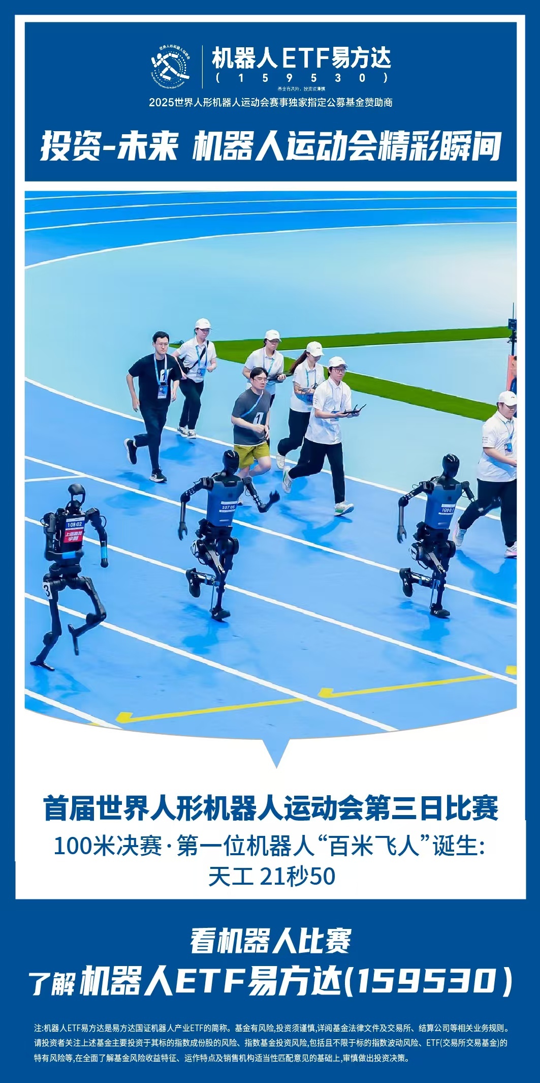 昨日,2025世界人形机器人运动会迎来最具看点的100米短跑决赛,天工Ultra机器人以21.5秒的成绩力压群雄,也是唯一采用全自主导航系统完成百米竞赛的人形机器人,展现了在复杂动态环境下实时环境理解与自主运动规划。宇树科技旗下两支队伍分获二、三名。 据悉,100米短跑是本届运动会参赛阵容最庞大的项目,共有23组90位机器人选手参与预赛,最终仅4支顶尖队伍晋级决赛,人形机器人产业活力显现。 长江证券认为,本次机器人运动会全面展现了人形机器人在智能决策、运动协作等领域的前沿成果;天宫Ultra机器人无需人工遥控或干预,体现了机器人“大脑”的进步;机器人运动会证明当前人形机器人在系统稳定性、关节性能、控制算法、大脑等各方面相较上半年均有较明显提升,产业加速发展。 作为赛事唯一的公募基金官方赞助商,机器人ETF易方达(159530)持续获得市场关注,强势“吸金”态势下,近一月规模激增150%。该产品跟踪的国证机器人产业指数中,人形机器人相关个股占比近八成,是更纯粹的“人形机器人”指数,可助力投资者分享产业发展红利。