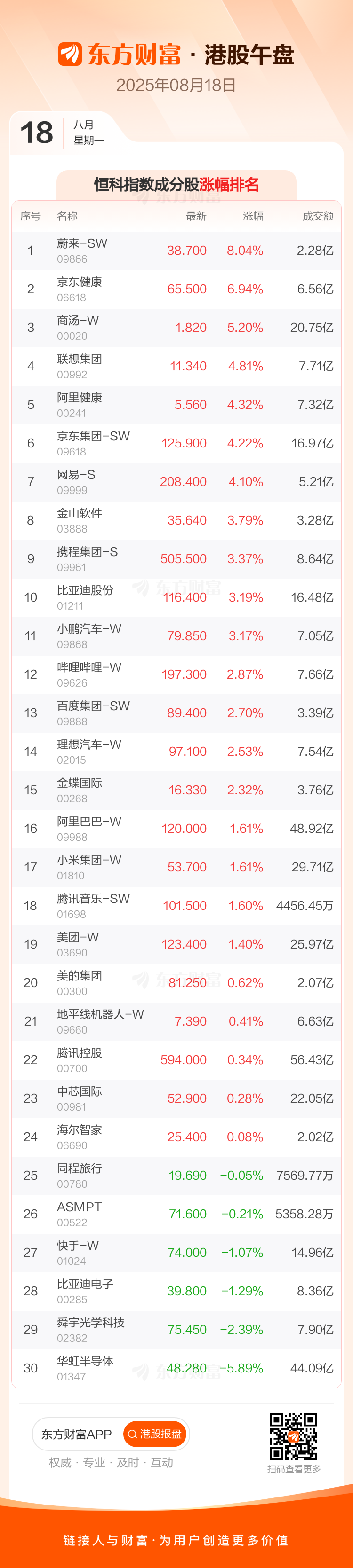 港股8月18日午盘走高,恒生指数收报25426.53点,涨156.46点,涨幅0.62%;恒生科技指数收报5651.97点,涨108.8点,涨幅1.96%。恒生指数成分股中京东健康、联想集团、阿里健康涨幅居前,康师傅控股、龙湖集团、舜宇光学科技跌幅靠前。恒生科技指数成分股中蔚来-SW、京东健康、商汤-W涨幅居前,华虹半导体、舜宇光学科技、比亚迪电子跌幅靠前。 ![]() ![]() 免责声明:本文基于AI生产,仅供参考,不构成任何投资建议,据此操作风险自担。 (文章来源:东方财富研究中心) |