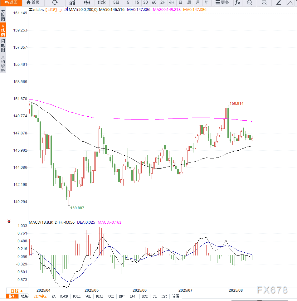 周一亚洲交易时段,日元兑美元继续走弱,但整体缺乏跟进性抛压。主要原因是避险情绪有所缓解,加上日本央行加息时机仍存在不确定性,使得市场资金对日元保持谨慎。 ![]() 特朗普还将在本周与乌克兰总统泽连斯基和欧洲领导人举行会晤,继续推动和平谈判。 在日本方面,国内政治不确定性和关税压力令市场质疑日本央行是否会继续推进政策正常化。然而,日本二季度经济增长好于预期,加之央行上调通胀预期,使得年内加息的可能性依旧存在。 相比之下,美国市场预计美联储将在9月降息25个基点,并在2025年进一步放松政策,但“超预期降息”的可能性正逐渐降温。 美国最新零售销售数据表现稳健,增强了消费韧性,而密歇根大学消费者信心指数意外下滑,凸显市场信心不足。不过,通胀预期走高叠加生产者物价指数强劲,进一步削弱了市场对美联储快速宽松的期待。 “投资者对日本央行是否会在年内加息依然存有争议,而美联储的政策路径则更偏向于逐步宽松。这种分化导致美元兑日元走势保持区间震荡。”——东京某投行外汇分析师 “强劲的通胀数据让市场对9月‘大幅降息’的押注有所降温,美联储可能会采取循序渐进的方式。”——IG市场分析师Tony Sycamore 从日线图来看,美元兑日元近两周在146.20至148.60区间震荡整理,显示出典型的盘整格局。短期支撑位位于147.00一线,如跌破可能打开下探145.40—145.00区间的空间。 上方阻力位集中在148.00及148.60附近,若有效突破,则有望延伸至149.00整数关口。技术指标方面,MACD动能中性,RSI位于50附近,说明多空力量暂时均衡,需等待突破方向确认。 ![]() 整体来看,美元兑日元的走势正处于政策与消息面博弈的关键阶段。避险情绪缓解对日元形成压力,而日本央行的加息不确定性则部分抵消这一影响。 美联储是否在9月释放更清晰的降息信号,将成为决定区间突破方向的关键。短期内,美元兑日元仍可能维持震荡格局,突破的时机或在杰克逊霍尔会议之后出现。 ![]() |