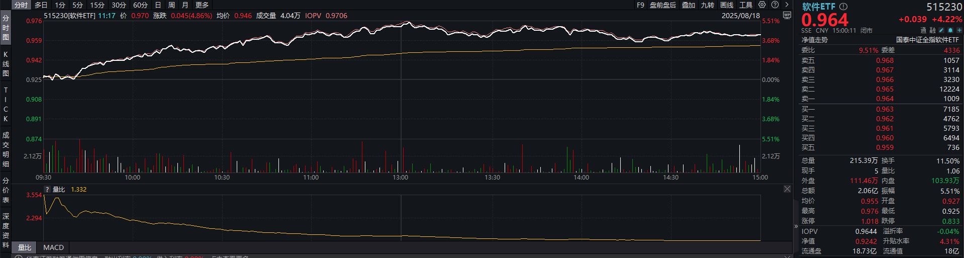 每经编辑|叶峰 今日A股三大指数集体上涨,沪指涨0.85%,深成指涨1.73%,创业板指涨2.84%,北证50指数涨6.79%,全市场成交额28091亿元。 今日软件ETF(515230)涨幅达4.22%。 上涨驱动因素分析 市场活跃 ...
