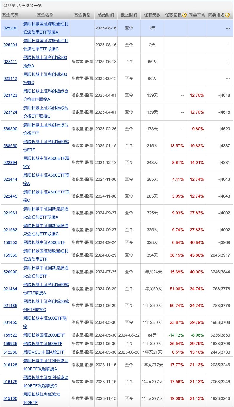 2、ETF主题机会 2025年初,国务院办公厅印发《关于推动文化高质量发展的若干经济政策》的通知,明确强调要推动文化领域精品创作,特别包括影视、动漫等重点内容创作。此前在行业常态化监管环境下,有关部门对价值观导向做出了有力引导,随着不良内容陆续出清,后续方向正在逐渐转向扶持精品、鼓励供给。未来行业规范将更多趋向于呵护、包容,对优质内容生产的支持力度提升,影视行业整体环境有望改善,信心恢复、供给修复在即。可关注影视ETF等产品。 四、明日重点关注新发基金1、基金简称:景顺长城国证港股通红利低波动率ETF联接 基金类型:股票型发起式—ETF联接 基金经理:龚丽丽、张晓南 业绩比较基准:国证港股通红利低波动率指数收益率(使用估值汇率调整)×95%+人民币活期存款税后利率×5% 基金经理过往业绩: