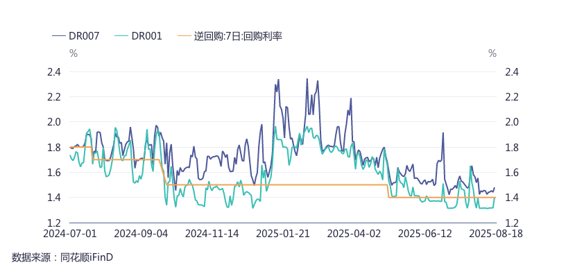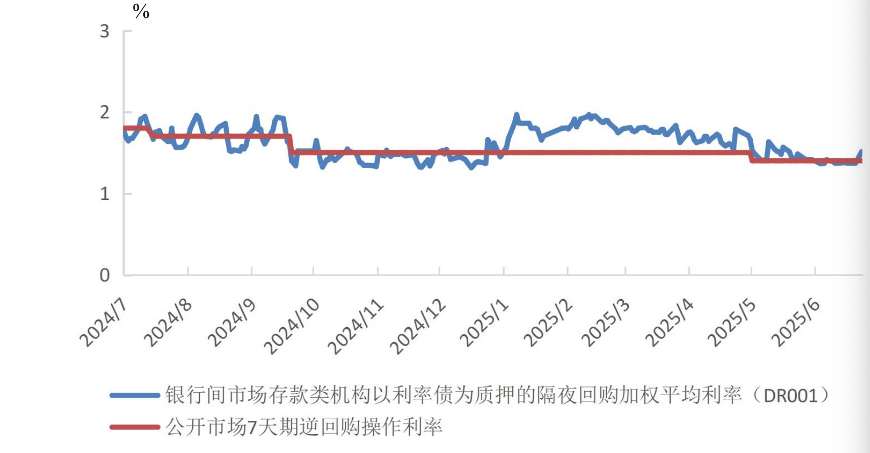 中国人民银行近期公布的《2025年第二季度中国货币政策执行报告》在展示货币市场利率走势时用了DR001(银行间存款类机构以利率债为质押的隔夜回购加权平均利率)这一指标。图示还显示,DR001围绕7天逆回购利率波 ...