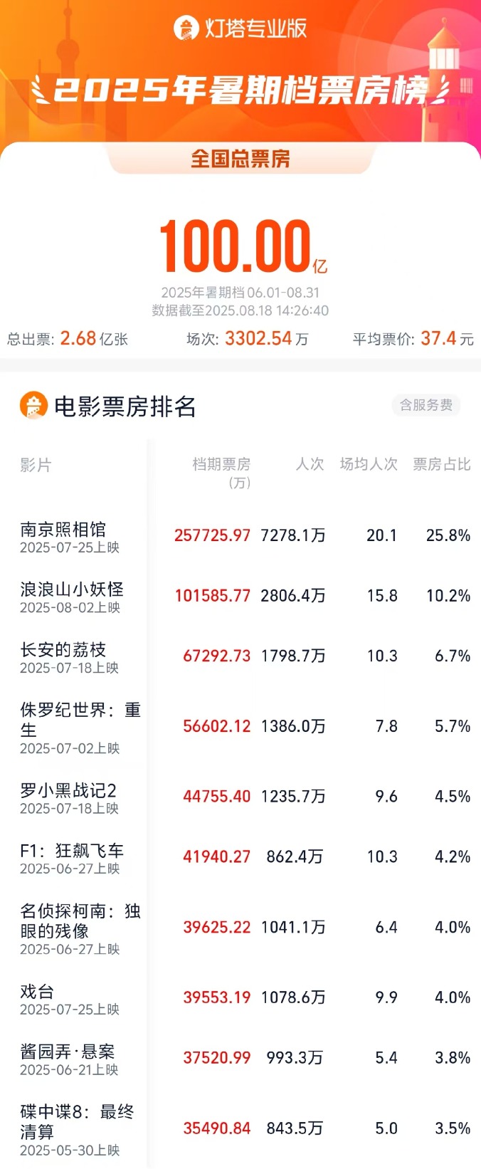 据灯塔专业版,截至8月18日14时26分,2025年暑期档(6月-8月)总票房(含预售)突破100亿元。《南京照相馆》《浪浪山小妖怪》《长安的荔枝》《侏罗纪世界:重生》《罗小黑战记2》暂列档期票房前五名,其中国产片 ...