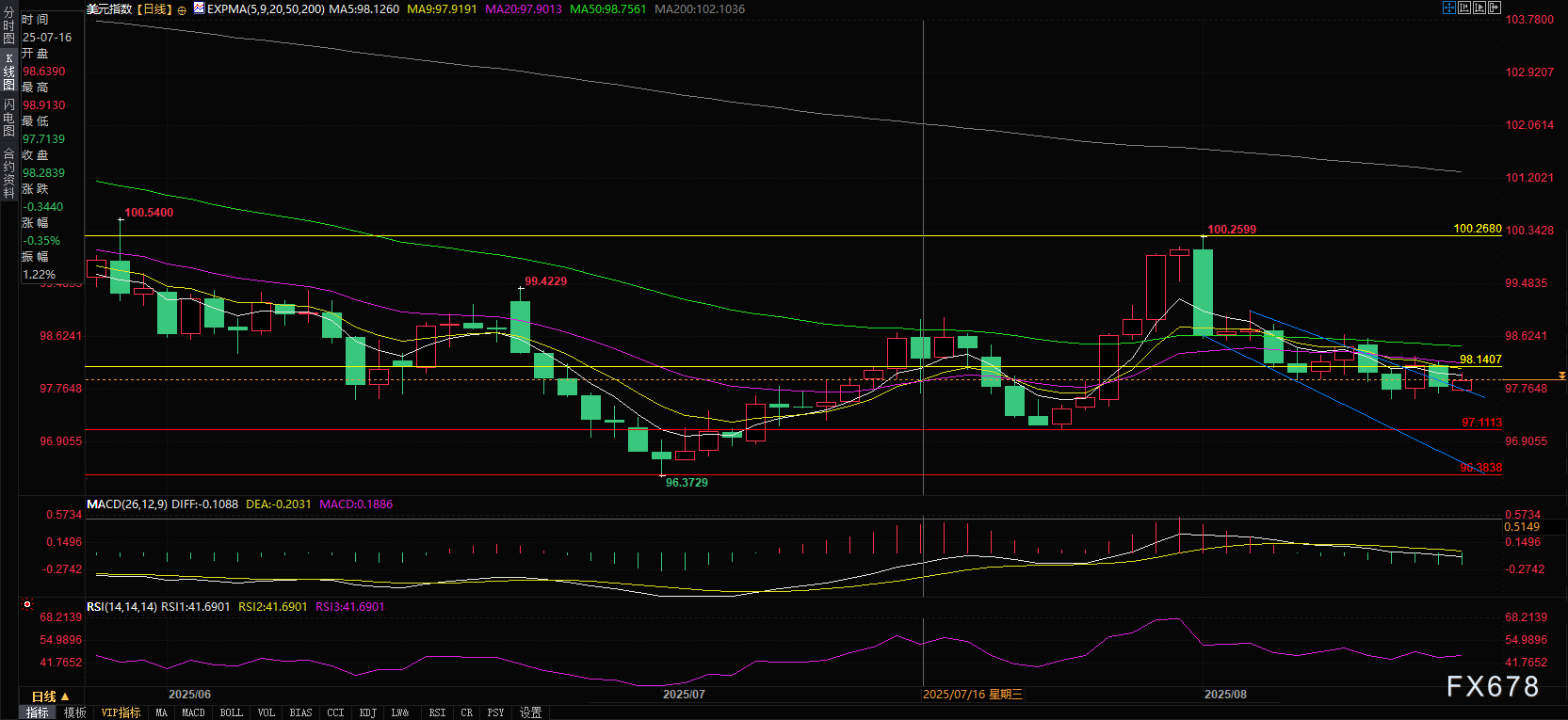 周一 8月18日 欧市时段 衡量美元兑六大主要货币价值的美元指数 DXY 交投于98 00附近 较前一交易日纽约汇市收盘价97 85微幅波动 整体维持窄幅震荡格局 日线图技术分析显示 美元指数仍处于下降通道形态内运行 暗示整体 ...