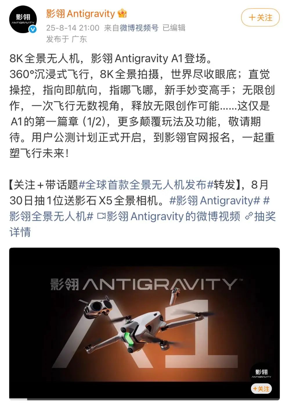 8月14日,影石创新和第三方共同孵化的消费级无人机品牌影翎Antigravity,发布其首款产品——影翎AntigravityA1,这也是全球首款8K全景无人机。 首款产品公布后,8月15日和8月18日两个交易日,影石创新股价连 ...