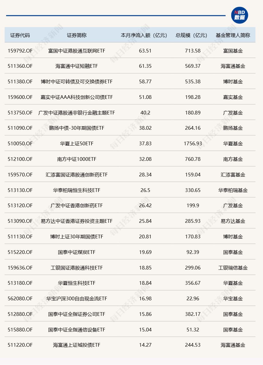 每经记者|肖芮冬 每经编辑|赵云 昨日市场全天冲高回落,沪指创近10年新高,北证50创历史新高,深成指、创业板指均突破去年10月8日高点。板块方面,液冷服务器、影视、CPO、稀土永磁等板块涨幅居前,煤炭、有色金属、钢铁等板块跌幅居前。 Wind数据显示,在8月18日的非货币ETF市场中,博时上证30年期国债ETF份额增加0.14亿份,净流入额为15.04亿元;鹏扬中债-30年期国债ETF份额增加0.11亿份,净流入额为12.74亿元;华宝中证全指证券公司ETF份额增加18.17亿份,净流入额为11.43亿元。 与此同时,华夏上证科创板50ETF份额减少13.10亿份,净流出额为15.48亿元;易方达中证科创创业50ETF份额减少9.03亿份,净流出额为6.09亿元;富国中债7-10年政策性金融债ETF份额减少0.05亿份,净流出额为5.67亿元。 截至8月18日,8月资金净流入额居前20的ETF名单如下: 总体看来,Wind数据显示,8月18日全市场ETF份额为27724.99亿份;总规模为48033.49亿元。近一周,份额增加最大的行业为医药,有9只基金跟踪。份额增加最大的主题为中证酒指数,有1只基金跟踪。份额增加最大的指数标的为恒生科技,有10只基金跟踪;收益最高的指数标的为金融科技(+13.72%),有3只基金跟踪。 |