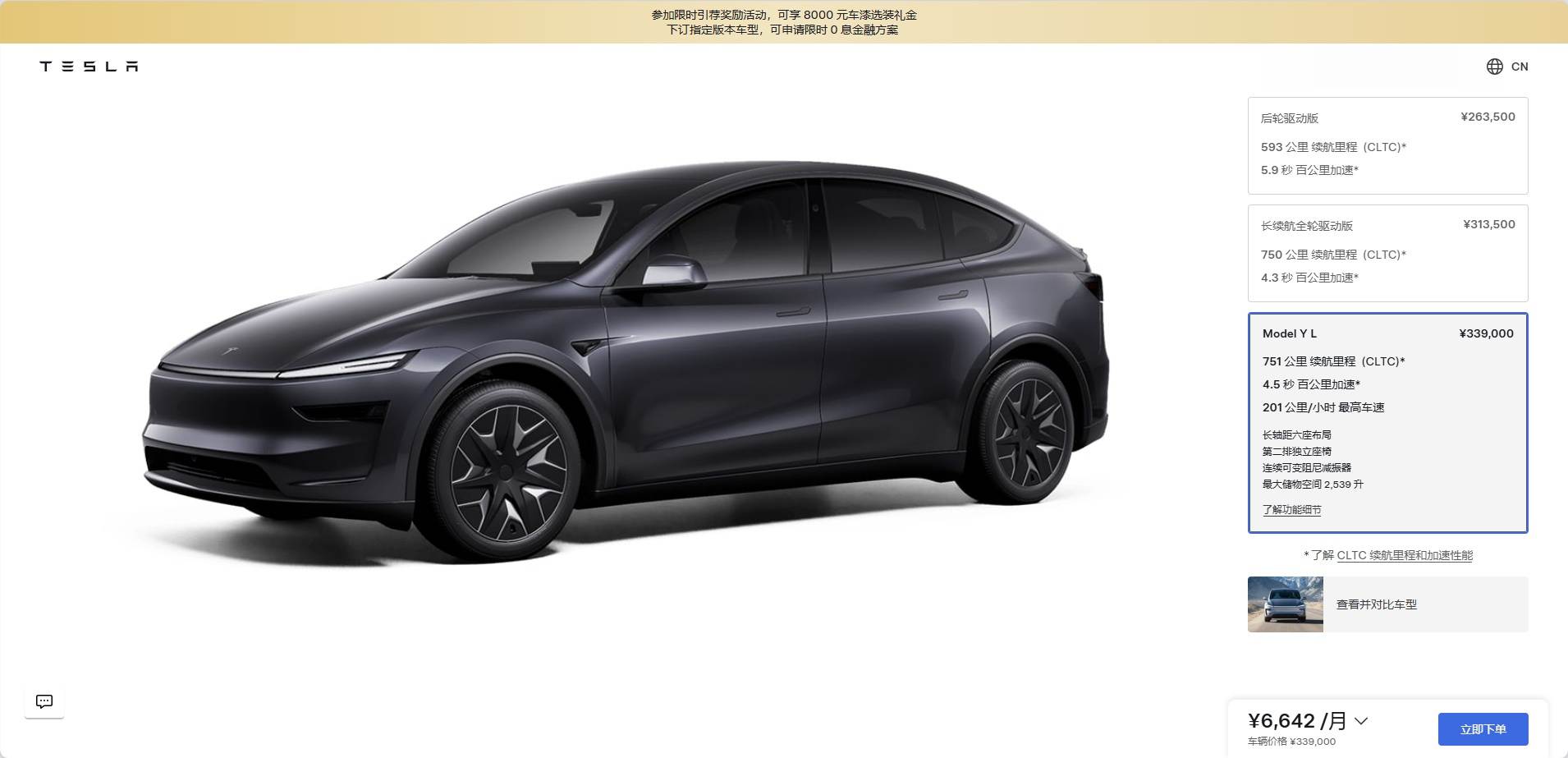 【大河财立方消息】8月19日,特斯拉上线Model Y L车型,起售价33.9万元,预计交付时间为2025年9月。 特斯拉还提供了部分优惠方案。其中,Model Y后轮驱动版/长续航全轮驱动版首付7.99万元起,可申请1~5年0息方案;Model Y L首付9.99万元起,可申请1~3年0息方案;Model Y全系车型首付4.59万元起,可申请1~ 5年超低息方案,年费率低至0.5%起(折合年化利率0.92%起)。 特斯拉表示,9月30日(含)前购买指定版本 Model Y后轮驱动版、长续航全轮驱动版、Model Y L,并按订单中交付和付款条件于订单到期日前提车,符合申请资质的客户可申请上述金融特惠方案。