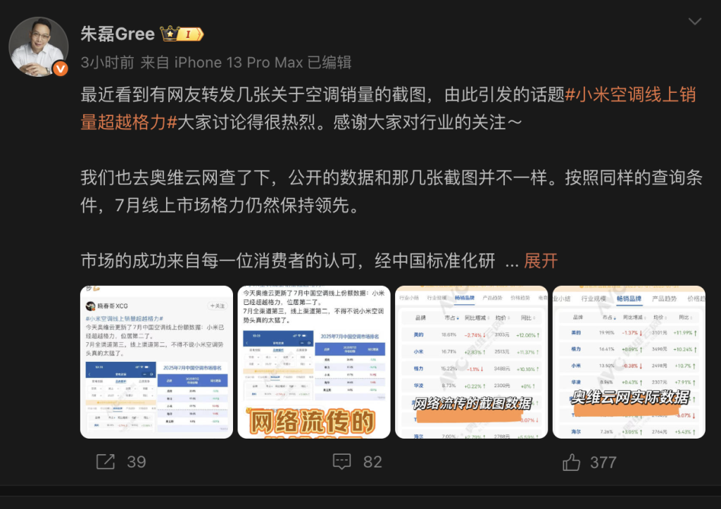 到底谁才是今年7月份线上空调市场的第二名?小米还是格力? ![]() 8月18日晚,格力电器市场总监朱磊在微博上发文反击“小米空调线上销量超越格力”说法,称“我们也去奥维云网查了下,公开的数据和那几张截图并不一样。按照同样的查询条件7月线上市场格力仍然保持领先。” 近日,有网友发文称奥维云网更新了7月份中国空调线上份额数据,小米已经超越格力,位居第二。7月份全渠道第三,线上渠道第二。并且贴出的截图显示:7月份线上空调,小米市场份额为16.71%,格力电器为15.22%,分别是第二、第三名。 8月16日,小米集团总裁卢伟冰转发了小米空调是第二名的信息并留言称“能力的提升,才能赢得高质量的增长,再次感谢大家对小米大家电的支持。” 小米集团公关部总经理王化也转发了相关信息,称“没想到新时代这么快就……来了。” 8月18日,澎湃新闻记者也查询了奥维云网的数据,查询结果显示:7月份线上空调市场份额第一名为美的(19.98%)、第二名为格力(16.41%),第三名为小米(13.50%)。小米市场份额与格力电器还有近三个百分点差距。 近年,小米在大家电领域不断攻城略地,市场增长远超行业平均水平,也挤压其他大家电巨头的市场。但总体来说,小米大家电走得是价格实惠的性价比路线,而格力等传统家电巨头走的是中高端路线,形成了一定的差异化竞争。如果有一天,小米空调销量超过格力,那将是行业一次重要的标志性事件。 但格力也不会轻易退缩。毕竟,空调业务占格力电器近八成营收。 朱磊表示,市场的成功来自每一位消费者的认可,经中国标准化研究院评定,格力空调已经连续16年顾客满意度第一,在“品牌形象、性价比、满足需求程度、产品可靠性、服务质量”五大维度位列行业首位。 “良性竞争对行业和用户来说都是好事。我们也欣喜地看到同行们不断投入,一起推动行业进步。格力会继续脚踏实地,把品质和服务放在第一位,用真正的价值,真实的价值赢得大家的信任。”朱磊表示。
