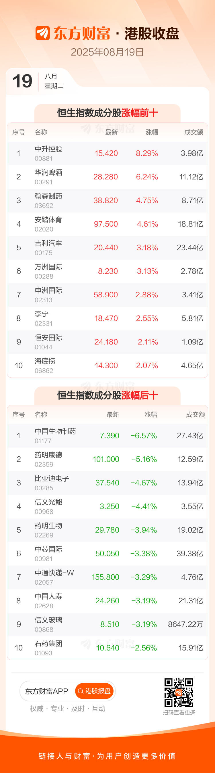 港股8月19日收盘走低,恒生指数收报25122.9点,跌53.95点,跌幅0.21%;恒生科技指数收报5542.03点,跌37.15点,跌幅0.67%。恒生指数成分股中中升控股、华润啤酒、翰森制药涨幅居前,中国生物制药、药明康德、比 ...
