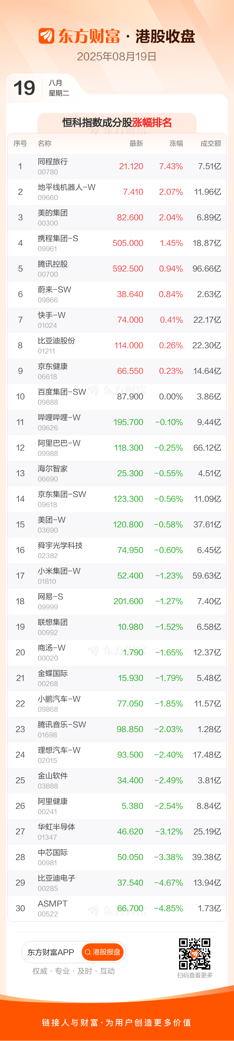 港股8月19日收盘走低,恒生指数收报25122.9点,跌53.95点,跌幅0.21%;恒生科技指数收报5542.03点,跌37.15点,跌幅0.67%。恒生指数成分股中中升控股、华润啤酒、翰森制药涨幅居前,中国生物制药、药明康德、比亚迪电子跌幅靠前。恒生科技指数成分股中同程旅行、地平线机器人-W、美的集团涨幅居前,ASMPT、比亚迪电子、中芯国际跌幅靠前。 ![]() ![]() 免责声明:本文基于AI生产,仅供参考,不构成任何投资建议,据此操作风险自担。 (文章来源:东方财富研究中心) |