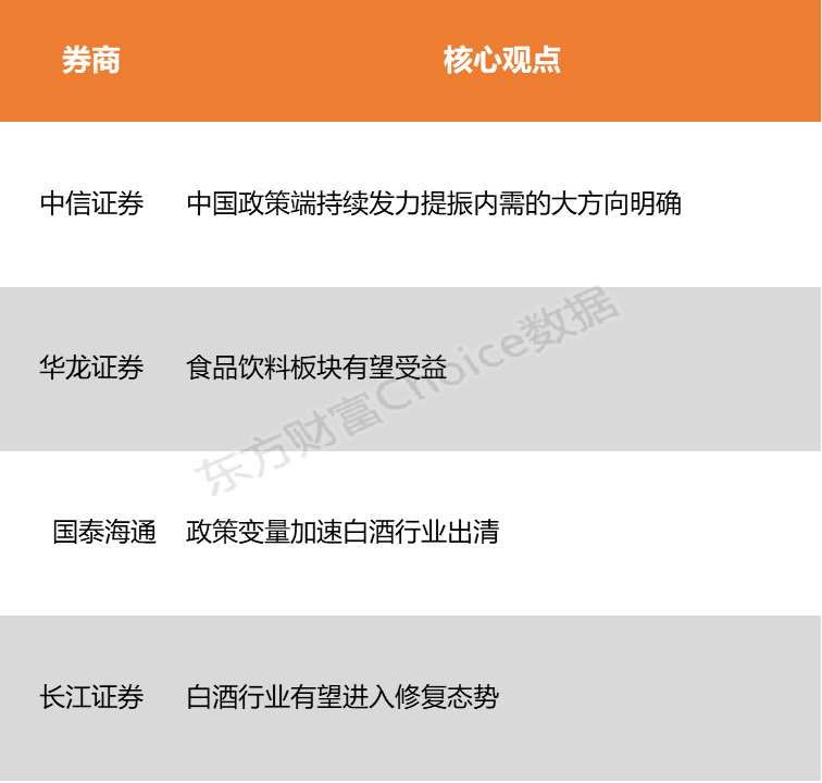 A股三大指数今日震荡整理,截止收盘,沪指跌0.02%,深证成指跌0.12%,创业板指跌0.17%。沪深两市成交额接近2.6万亿,较昨日缩量近2000亿。上涨股票数量接近3000只,逾百股涨停。 行业板块涨多跌少,汽车服务、酿酒行业、房地产服务、电机、装修装饰、小金属板块涨幅居前,保险、电子化学品、船舶制造、证券板块跌幅居前。 国务院总理李强8月18日主持召开国务院第九次全体会议,会议中强调,要抓住关键着力点做强国内大循环,持续激发消费潜力,系统清理消费领域限制性措施,加快培育壮大服务消费、新型消费等新增长点。中信证券认为,政策端持续发力提振内需的大方向明确,增量消费政策持续落地有望对消费形成改观,建议关注“新消费”的结构性机会以及“传统消费”基本面触底回升机会。华龙证券指出,降低居民消费信贷成本,助力释放居民消费潜力扩内需相关政策持续推出,食品饮料板块有望受益。 ![]() 中信证券:中国政策端持续发力提振内需的大方向明确 上半年内需呈现出一定复苏态势,但居民消费仍有较大提升空间,尤其是在下半年出口面临不确定性的背景下,中国政策端持续发力提振内需的大方向明确,增量消费政策持续落地有望对消费形成改观,建议关注“新消费”的结构性机会以及“传统消费”基本面触底回升机会。 华龙证券:食品饮料板块有望受益 为贯彻落实高层关于大力提振消费、全方位扩大国内需求的决策部署,根据《提振消费专项行动方案》,《个人消费贷款财政贴息政策实施方案》制定出台,降低居民消费信贷成本,助力释放居民消费潜力扩内需相关政策持续推出,食品饮料板块有望受益。 国泰海通:政策变量加速白酒行业出清 政策变量加速白酒行业出清,当下产业加速向业绩底迈进,股价亦有望先于需求侧出现拐点;同时,产业逻辑在颠覆中重塑,份额逻辑将逐步取代量价逻辑,长周期下,把握白酒的“类债资产”属性。 长江证券:白酒行业有望进入修复态势 从短周期来看,目前白酒行业仍处于主动去库存的磨底期。从需求端来看,政策短期形成一定冲击,但行业需求结构不同于上轮,后续随着宏观经济和居民消费信心的修复,有望进入修复态势。 (本文不构成任何投资建议,投资者据此操作,一切后果自负。市场有风险,投资需谨慎。) (文章来源:东方财富研究中心) |