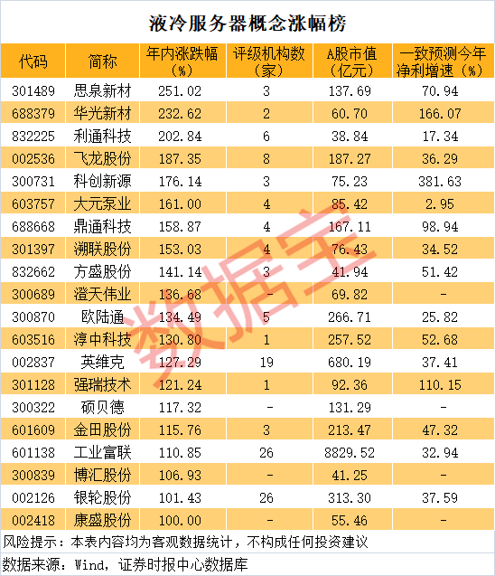 液冷概念成为近期最强题材。 AI硬件方向成为近期最强题材。截至昨日收盘(8月18日),液冷服务器、玻璃纤维、光模块、服务器、覆铜板、算力租赁等概念指数均大涨超10%,位居概念涨幅榜前列。其中,液冷服务器指数大涨超29%,高居AI硬件概念首位。 消息面上,7月初,CoreWeave宣布率先部署英伟达GB300 NVL72系统,成为首家提供该系统的超大规模AI云服务提供商,标志着首款GB300 NVL72服务器正式出货。 业内人士指出,领先AI芯片产品全面拥抱液冷,或将带动整个算力产业链的液冷需求显著提升。 液冷需求有望暴增 GB300是英伟达今年发布的面向高性能计算和云服务领域的一款AI推理架构新产品,算力性能持续提高的同时,功耗也大幅增加,为此GB300采用了完全液冷式机架规模设计。此外,近日华为昇腾发布的重磅384超节点服务器集群也采用了液冷+微结构导热方案。 液冷技术是指利用液体取代空气作为冷却介质,与服务器发热元器件进行热交换,将服务器元器件产生的热量带走,以保证服务器工作在安全温度范围内的一种冷却方法。伴随着AI芯片性能升级造成功耗持续提升,数据中心液冷已成大势所趋。近期,产业需求、政策驱动及预期差出现的边际变化三重共振,催生了液冷板块高景气的行情。 华西证券认为,随着海外算力需求爆发,主要CSP厂商资本开支上行趋势明确,GPU和ASIC需求均有望实现快速增长,液冷需求空间广阔。同时,考虑到CSP厂商的降本需求,国内液冷相关供应商有望在海外市场实现突破以及提升份额,持续看好已和海外大厂有合作经验或积极布局海外市场的液冷系统解决方案及零部件厂商。 液冷概念龙头曝光 据证券时报·数据宝统计,A股市场上液冷服务器概念股合计有122只,市值接近3.7万亿元。其中,工业富联市值超过8800亿元居首。今日早盘(8月19日)该股继续创出历史新高,市值突破9000亿元。此外,立讯精密、中兴通讯、中科曙光等市值均超千亿元。 从股价表现来看,液冷概念股年内平均涨幅超56%,远强于大盘同期表现。其中,思泉新材、华光新材、利通科技、飞龙股份、科创新源等股价翻倍。 从概念股液冷成色来看,飞龙股份、大元泵业、英维克、银轮股份等个股的业务相关性更强。 大元泵业在调研中称,目前公司液冷温控业务主要涵盖新能源汽车、储能风电、算力服务三大领域,公司2025年相关业务将明显受益于2024年完成的部分重点客户拓展。后续公司将继续加大投入,挖掘其他新兴领域的液冷温控需求,紧跟并抓住科技发展的机遇。 源达信息认为银轮股份作为汽车热管理龙头企业,向液冷领域拓展,具备技术、客户资源优势。源达信息称公司液冷产品矩阵齐全,有望受益于液冷行业放量,带来业绩释放。 ![]() 机构关注这些滞涨股 滞涨股会否补涨?数据显示,合计有21只液冷概念股年内涨幅不足20%且有机构评级。从市值角度来看,四方科技、永贵电器、恒为科技、八亿时空等市值均不足百亿元。 永贵电器在互动易中透露,公司液冷快换接头UQD标准接口主要应用于算力服务器领域,数据中心连接解决方案的开发及应用是公司布局方向。 四方科技在其年报中表示,公司新型集装箱式V型干冷器在IDC数据中心展进行展出,并为多家企业提供了测试用样机。 ![]() (文章来源:证券时报网) |