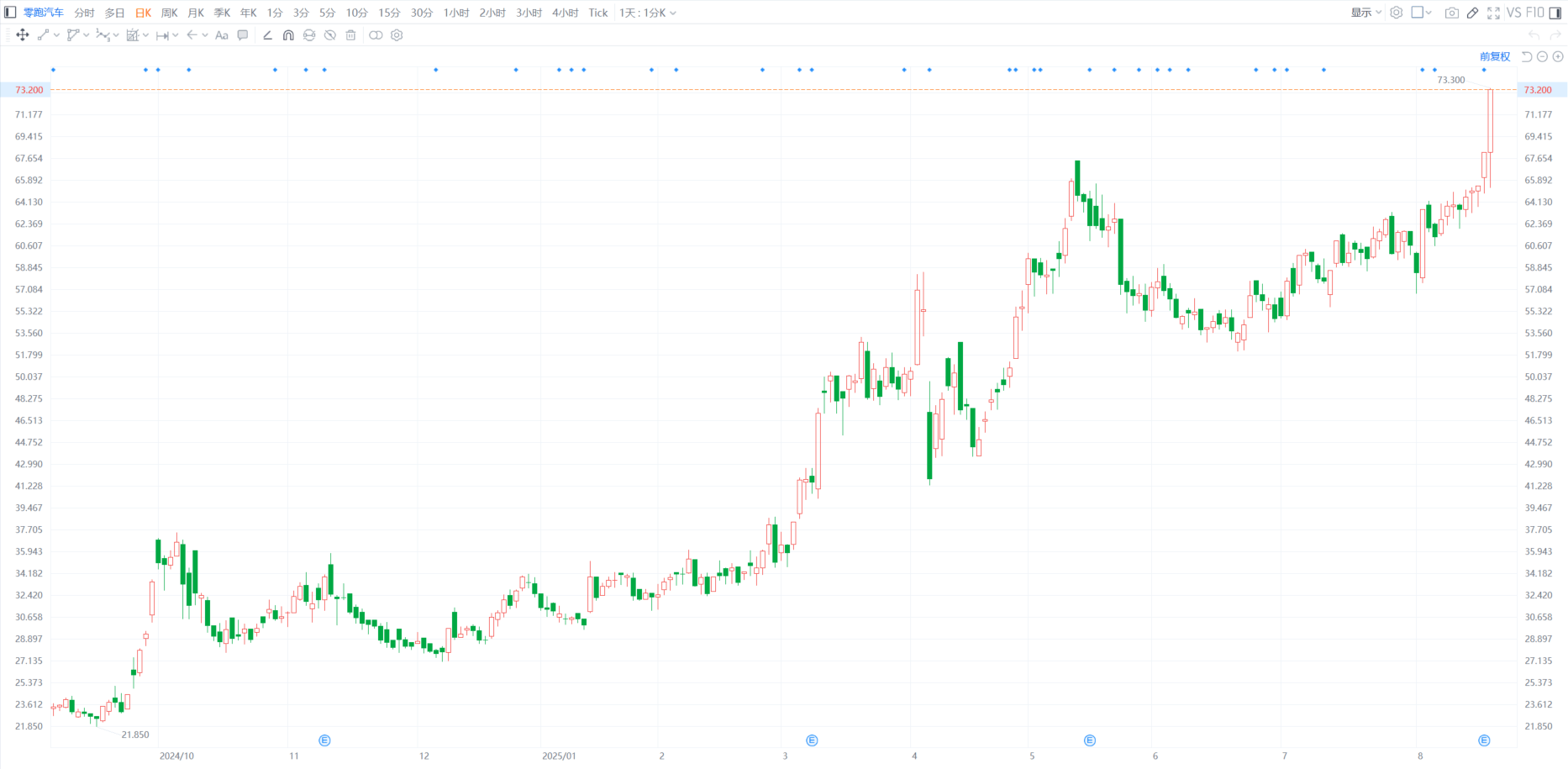 0格隆汇8月19日|零跑汽车(9863.HK)午后涨幅扩大,一度涨7.56%至73.3港元,股价创历史新高,年内累涨1.25倍。零跑汽车昨日晚间公告,截至2025