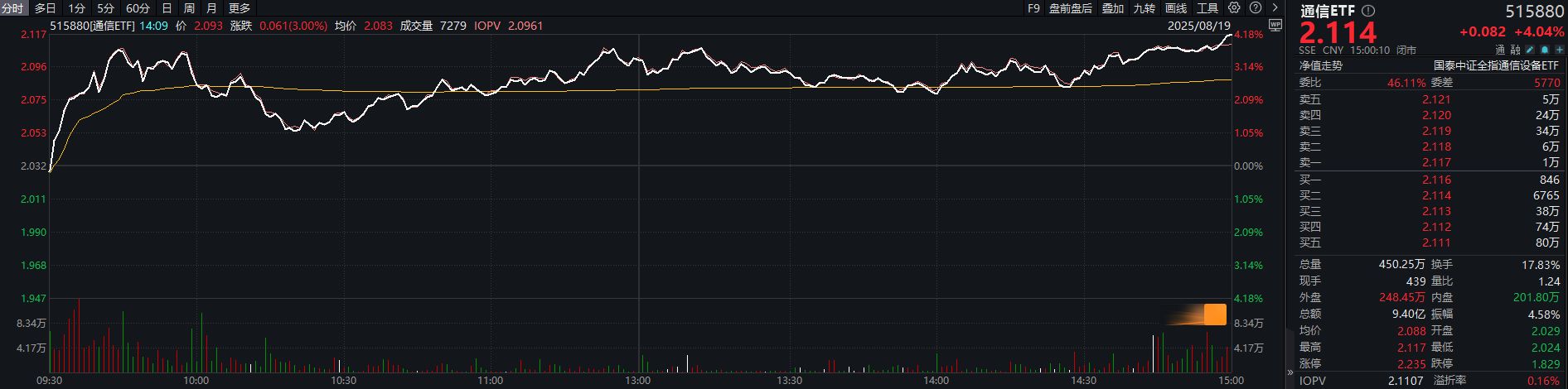 每经编辑|叶峰 今日市场全天冲高回落,三大指数微跌。沪深两市全天成交额2.59万亿,较上个交易日缩量1758亿。沪指收跌0.02%,深成指跌0.12%,创业板指跌0.17%。 通信ETF今日逆势上涨,收涨4.04%。截至8 ...