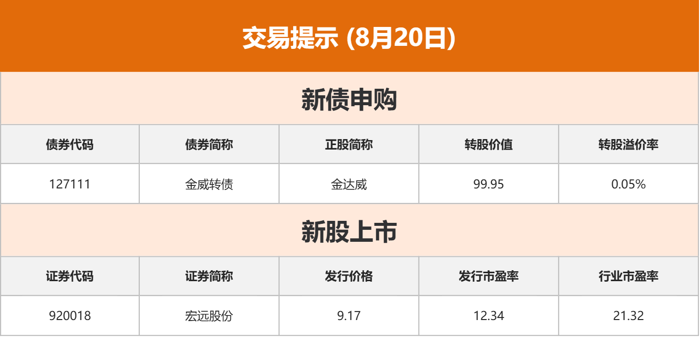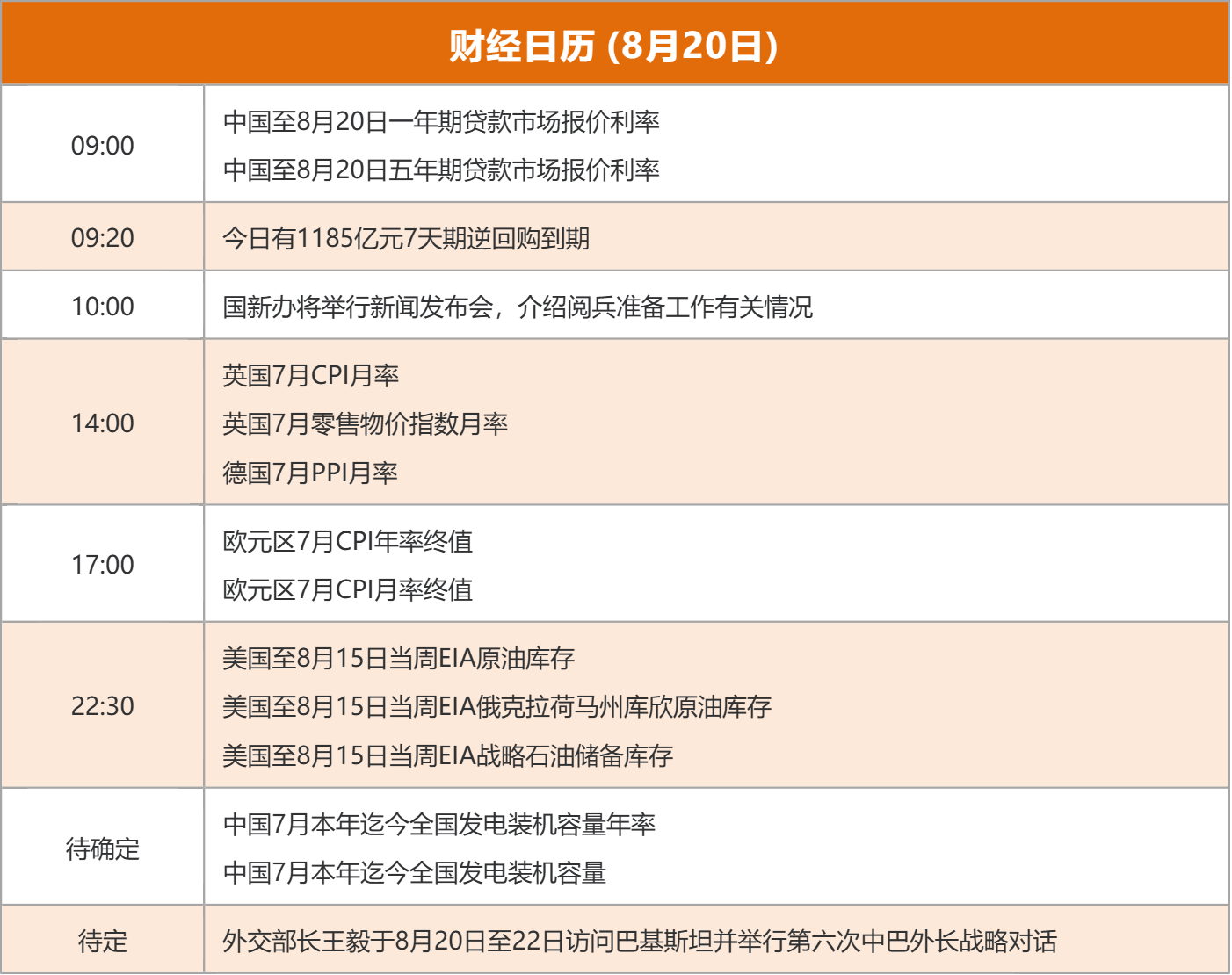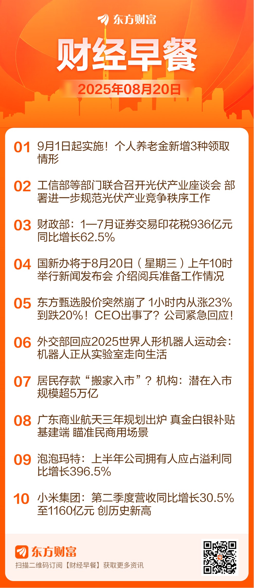 ![]() 每日精选中印关系: 当地时间2025年8月19日,印度总理莫迪在新德里总理府会见中共中央政治局委员、中央外办主任王毅。莫迪说,今年是印中建交75周年。双方要从长远角度看待两国关系,“亚洲世纪”的到来离不开印中合作。双方携手并进将为世界发展作出贡献,造福全人类。王毅表示,中印关系经历起伏,其中的经验教训值得铭记。无论面临什么样情况,双方都应坚持彼此是伙伴而不是对手的正确定位,坚持稳妥管控分歧,不让边界争议影响两国关系大局。 个人养老金: 8月19日,人力资源社会保障部等5部门对外发布《关于领取个人养老金有关问题的通知》,自9月1日起开始实施。通知规定,新增以下3种个人养老金领取情形:申请之日前12个月内,本人(或配偶、未成年子女)发生的与基本医保相关的医药费用支出,扣除医保报销后个人负担(指医保目录范围内的自付部分)累计超过本省(自治区、直辖市)上一年度居民人均可支配收入;申请之日前2年内领取失业保险金累计达到12个月;正在领取城乡最低生活保障金。 光伏行业: 工业和信息化部、中央社会工作部等部门8月19日联合召开光伏产业座谈会,进一步规范光伏产业竞争秩序。会议要求,光伏产业各方要深刻认识规范竞争秩序对光伏产业高质量发展的重要意义,共同推动产业健康可持续发展。一是加强产业调控,二是遏制低价无序竞争,三是规范产品质量。 印花税: 财政部发布2025年1—7月财政收支情况显示,印花税为2559亿元,同比增长20.7%。其中,证券交易印花税936亿元,同比增长62.5%。据财政部此前发布的数据,上半年证券交易印花税收入为785亿元,同比增长54.1%。这意味着今年7月证券交易印花税为151亿元,相较于6月的117亿元,环比增长29%。此外,2024年7月证券交易印花税为67亿元,同比来看,今年7月证券交易印花税增长1.25倍。 人形机器人: 19日当天,有媒体报道称,鸿海将在11月举行的鸿海科技日中,推出与英伟达合作开发的最新一代人形机器人以及实际场景应用案例。鸿海发言人表示,鸿海密切关注机器人领域的各种发展,与英伟达在此领域多方合作,在人形机器人大脑开发上进行多技能AI模型的训练。此前,市场已传出,鸿海位于美国休斯敦的新工厂将导入与英伟达合作的人形机器人,预计明年第一季度上线,生产GB300 AI服务器。 稀土管制: 印度媒体报道称,王毅外长已经告诉印度官员,中国解除了对印度稀土出口的限制。对此外交部发言人表示,不了解具体的媒体报道的情况,我们愿意同有关国家和地区加强对话合作,共同维护全球产供链的稳定。 支农支小再贷款: 近日中国人民银行新增支农支小再贷款额度1000亿元,引导和鼓励金融机构加大对北京、河北、吉林、山东、甘肃等受灾地区的经营主体特别是小微企业、个体工商户,以及农业、养殖企业和农户的信贷支持力度。下一步,中国人民银行将督促相关省(区、市)分行用好用足新增支农支小再贷款额度,指导金融机构积极对接防汛救灾和灾后重建的融资需求,支持经营主体加快恢复生产经营。 东方甄选: 东方甄选今日发布公告声明关于周成刚的传闻纯属谣言,关于“东方甄选佣金率长期超30%”的说法严重失实,针对上述谣言,公司已启动报警和司法流程,对于这样的不法行为,将一追到底。此外,有消息称新东方CEO周成刚或涉关联交易被监管部门立案调查。东方甄选投资关系总监在微信群内对此传言表示:辟谣,没有这样的事情,我们还在年报静默期,感谢大家的支持! 热点题材华为概念: 8月17日,华为常务董事、终端BG董事长余承东在最新的《对话》栏目中表示,鸿蒙用户上百万是个艰难的过程,但很短的时间就到了1000万,到几千万可能会更快。将来全中国甚至全世界的终端都能跑鸿蒙,希望携手更多中国应用出海,通过鸿蒙框架走向世界。 消费电子: 按照惯例,苹果会在9月的秋季发布会上推出最新款iPhone手机。郑州富工联招聘公众号今日发布消息称,郑州富士康进入旺季高峰期。华为Mate XT 2非凡大师预计9月前后发布,Mate X7预计10月发布;苹果iPhone 17系列也预计9月发布;小米16系列预计9月25日—26日发布;OPPO、vivo等新机也将在9月底或10 月初发布。 商业航天: 广东省人民政府办公厅发布《广东省推动商业航天高质量发展若干政策措施(2025—2028年)》。其中指出,商业航天的产业链非常庞大,对于基建端,规划重点支持环节包括地面站网、商业航天卫星和火箭;同时规划提出打造商业航天应用“首场景”、支持卫星应用终端产品及零部件批量制造。 核电: 人工智能的高速发展推动数据中心电力需求飙升,也加快了下一代核能等新能源开发。当地时间8月18日,谷歌宣布,已选定田纳西州橡树岭合作建设一座先进核电站,这是谷歌首次部署位于田纳西州橡树岭的Hermes 2核电站,该核电站预计2030年开始为谷歌位于美国东南部的数据中心供电。 人工智能: 8月19日,《上海市加快推动“AI+制造”发展的实施方案》正式出台。其中提出,实施“模塑申城·AI+制造”行动,推动人工智能技术与制造业深度融合,推动企业创新应用人工智能技术,打造细分领域行业模型。推动AI计算机、AI眼镜和AI手机等新型智能消费终端迭代升级,加快引导产业链上下游企业集聚,促进智能终端产业集群发展。 存储芯片: 据报道,AI驱动以HBM3E和高容量DDR5为代表的高价值DRAM需求持续增长,以及二季度存储原厂EOL