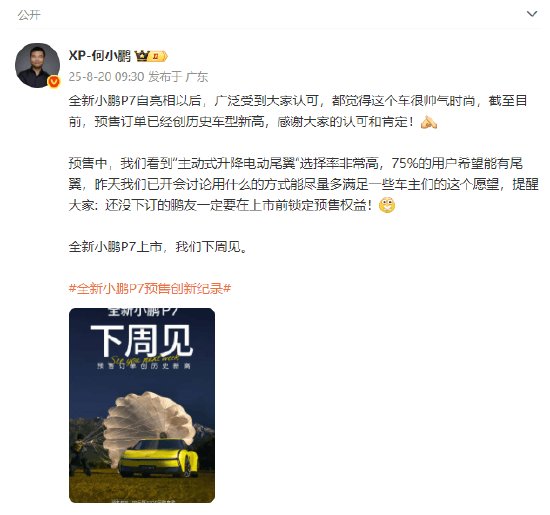 08月20日上午,何小鹏发微博表示,全新小鹏P7预售订单已经创历史车型新高。他还表示,预售中“主动式升降电动尾翼“选择率非常高,75%的用户希望能有尾翼,昨天已开 ...