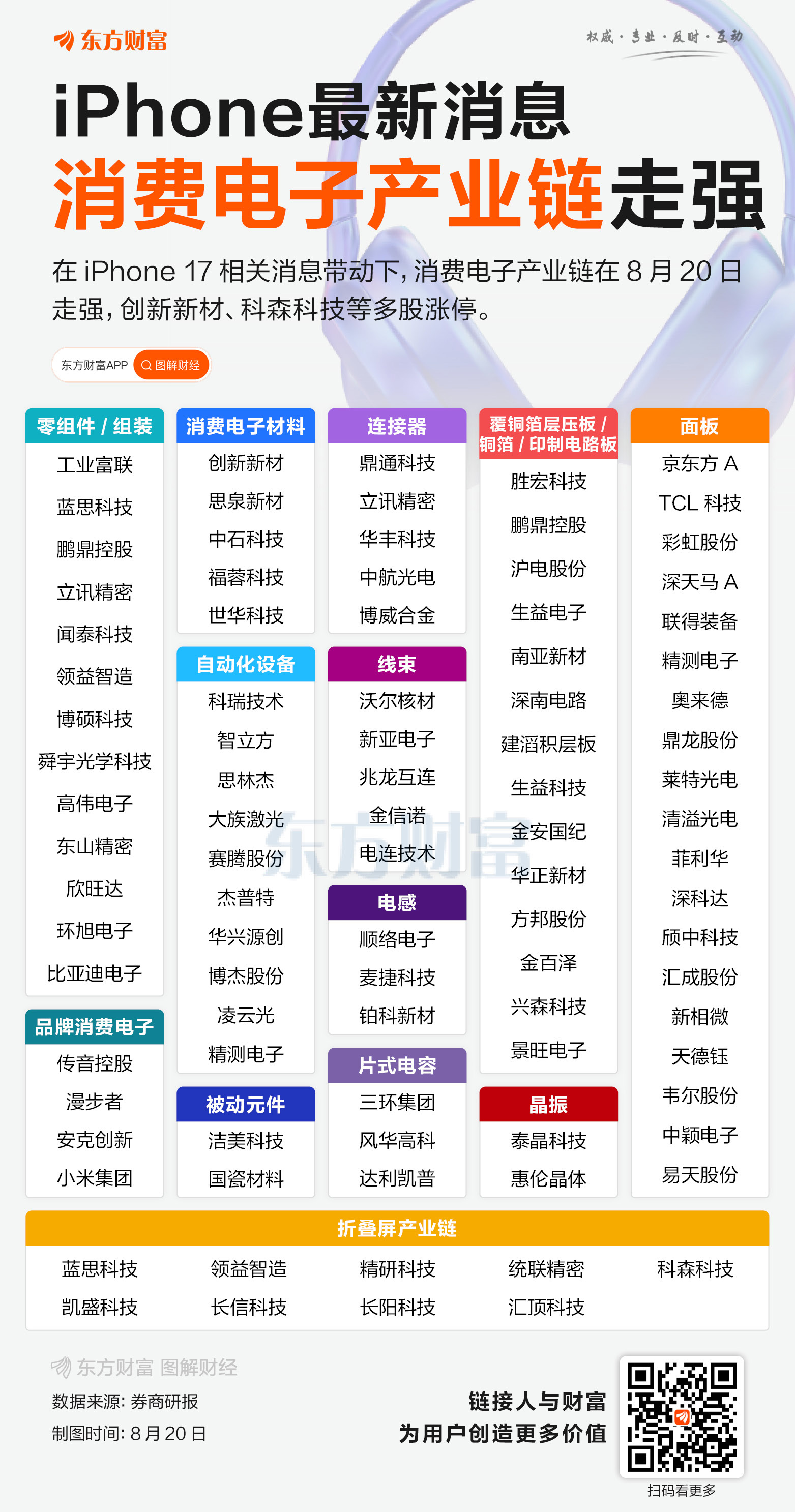 ![]() 消费电子产业链在8月20日表现强势,屏下摄像、3D摄像头、AI眼镜、3D玻璃、折叠屏等均居概念涨幅榜前列。个股方面,科森科技、创新新材等多股涨停;蓝思科技、领益智造等龙头股表现强势。港股的舜宇光学科技等也明显走高。 消息面上,iPhone 17的最新消息,被认为是消费电子走强的推动因素之一。据中国证券报报道,苹果iPhone 17已进入大规模量产阶段。此外,有数码博主曝光了iPhone 17 Pro工程机的SIM卡槽,以保证部分不支持eSIM的国家和地区正常上市;还有数码博主表示,iPhone 17系列与往年最大的不同,就在于用一款超薄的iPhone 17 Air替换了Plus型号等等。 据证券时报报道,未来消费电子行业催化事件密集,华为Mate XT 2非凡大师预计9月前后发布,Mate X7预计10月发布;苹果iPhone 17系列也预计9月发布;小米16系列预计9月25日~26日发布;OPPO、vivo等新机也将在9月底或10月初发布。 展望后市,浙商证券研报指出,消费电子行业正处于复苏周期叠加创新周期的向上趋势中。而在中泰证券看来,随着AI技术的不断成熟以及相关应用的逐步落地,各大海内外厂商开始推出AI手机、AI PC引领换机潮流,消费电子行业有望迎来新一轮复苏周期。 (文章来源:东方财富研究中心) |