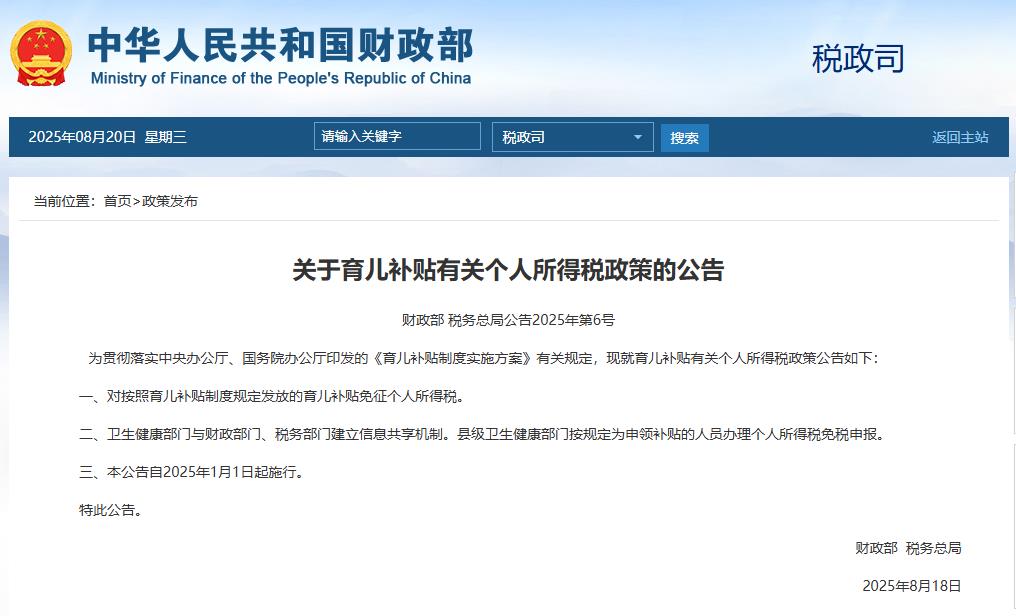 关于育儿补贴有关个人所得税政策的公告 财政部 税务总局公告 2025年第6号 为贯彻落实中央办公厅、国务院办公厅印发的《育儿补贴制度实施方案》有关规定,现就育儿补贴有关个人所得税政策公告如下: 一、对按照育儿补贴制度规定发放的育儿补贴免征个人所得税。 二、卫生健康部门与财政部门、税务部门建立信息共享机制。县级卫生健康部门按规定为申领补贴的人员办理个人所得税免税申报。 三、本公告自2025年1月1日起施行。 特此公告。 财政部 税务总局 2025年8月18日 ![]() (文章来源:财政部网站) |