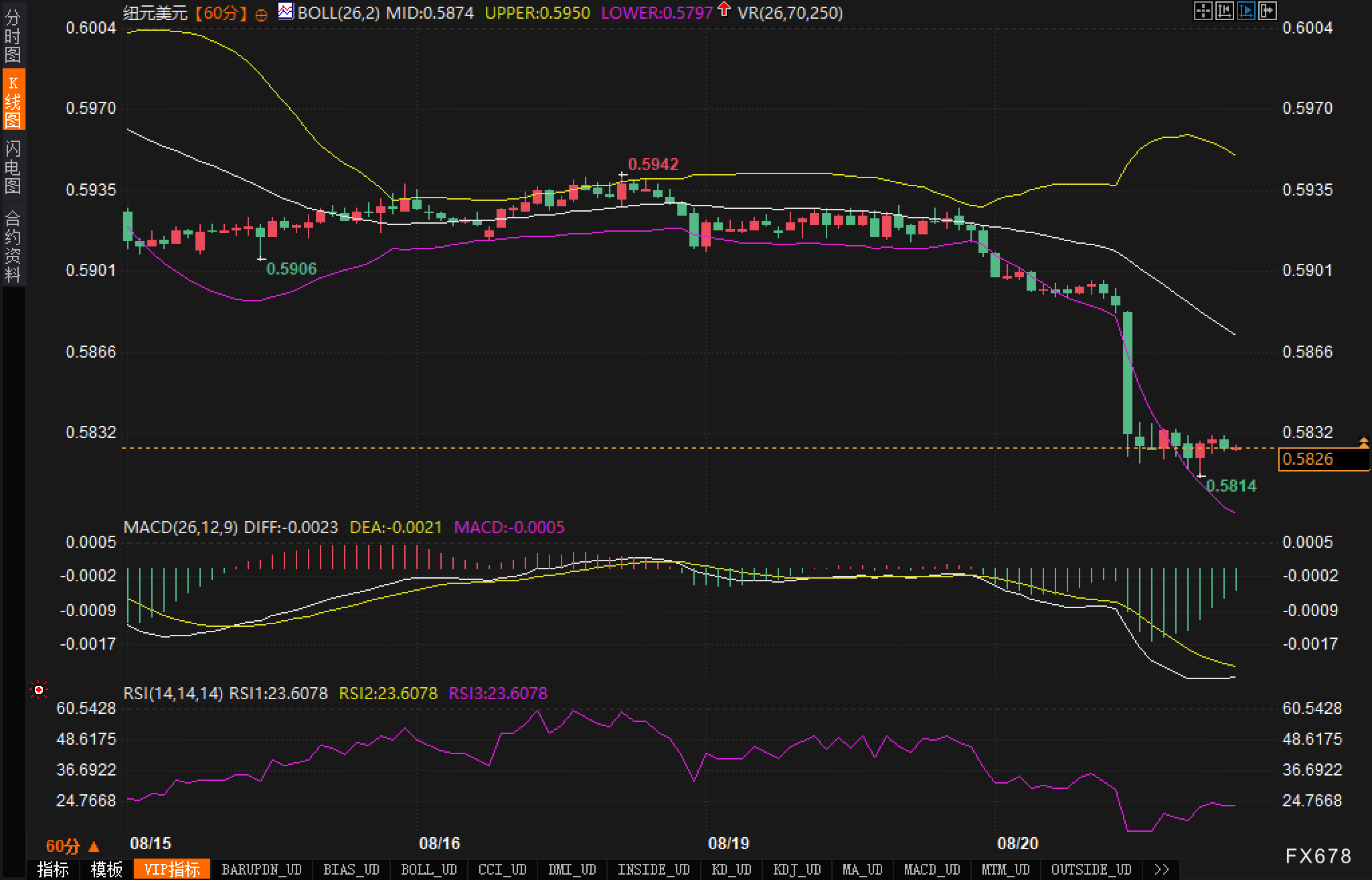 周三 8月20日 纽元兑美元继续领跌主要货币 盘中跌幅超过1 汇价在60分钟级别上击穿前期盘整平台后快速下探 最低触及0 5814 美市盘前围绕0 5830弱势横摆 整体行情驱动来自新西兰联储 RBNZ 如期将官方现金利率 OCR ...