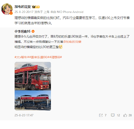 08月20日晚间,蔚来高级副总裁兼乐道汽车总裁沈斐转发网友微博,内容是乐道L90与理想I8卡车上挂的横幅对比。网友表示,明显i8的横幅挂的比L90的更工整[dog ...