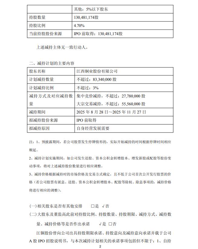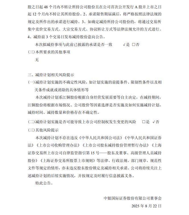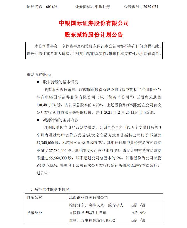 中银证券(601696)8月21日晚间公告,持股4.70%的股东江西铜业股份有限公司(简称“江西铜业”)计划3个交易日后的3个月内,通过集中竞价方式及/或大宗交易方式合计减持公司股份不超过8334万股,不超过公司总股本 ...