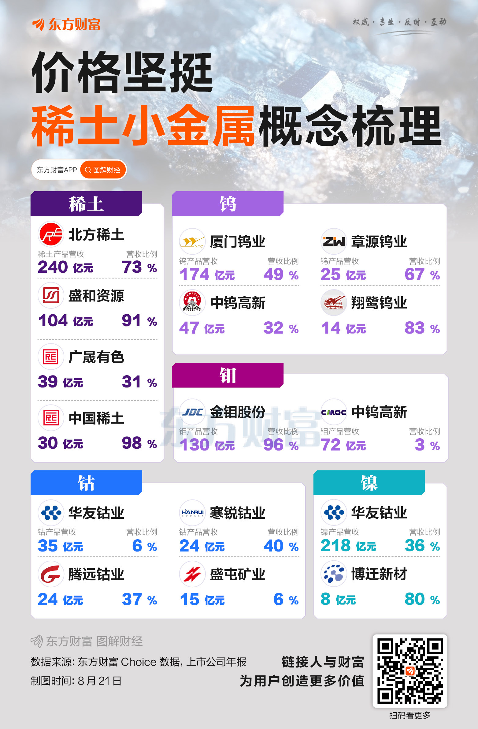 周四(8月21日)小金属概念再度活跃,钨、稀土方向领涨,章源钨业涨停,中国稀土、北方稀土涨幅靠前。 今年以来电解钴、氧化钨、镨钕氧化物等价格不断上行。第三方机构数据显示,截至8月21日,金属钴平均报价26 ...