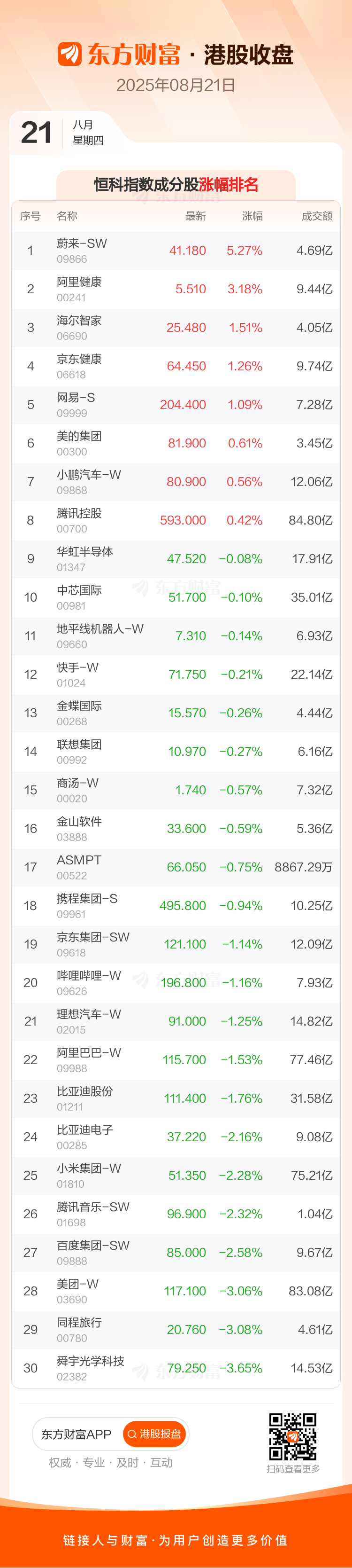 港股8月21日收盘走低 ,恒生指数收报25104.61点,跌61.33点,跌幅0.24%;恒生科技指数收报5498.5点,跌42.77点,跌幅0.77%。恒生指数成分股中中国生物制药、中国联通、阿里健康涨幅居前,华润电力、舜宇光学科技 ...