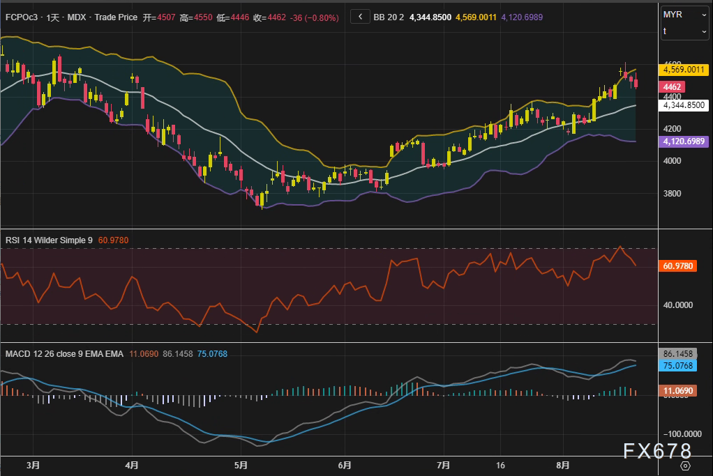 周四 8月21日 马来西亚衍生品交易所 BMD 棕榈油主力合约FCPOc3延续跌势 日内收报4462林吉特 吨 下跌36林吉特 跌幅0 8 尽管8月1 20日出口数据强劲 但受中国大商所植物油期货疲软拖累 市场未能守住4500林吉特 ...