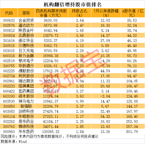 据证券时报·数据宝统计,有23股二季度机构(券商、社保、QFII、险资等四类)合计持仓翻倍且期末持股市值超过5000万元。 从期末持股市值来看,排名前五的分别是华东医药、恩华药业、昆药集团、锦浪科技、新强 ...