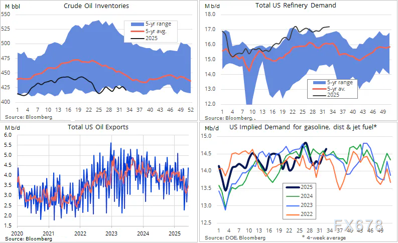 原油价格目前仍被困在相对狭窄的区间内:WTI原油在62美元/桶附近获得支撑,布伦特原油则在65美元/桶附近震荡。市场仍在权衡多空双重驱动因素,加之夏季市场流动性不足,价格始终处于区间波动中,交易员则在寻找或等待下一个具有决定性的催化因素。 ![]() ![]() 另一个支撑因素来自地缘政治层面,具体而言是美国政府持续施压,试图限制印度对俄罗斯原油及成品油的进口。自2022年以来,印度已成为俄罗斯最大的能源客户之一,若印度从俄罗斯的能源进口量出现实质性下降,将收紧全球原油供需平衡,进而支撑油价。尽管俄罗斯方面已作出反驳,称印度将维持当前的采购规模,但这一议题仍是潜在的油价支撑来源。 与此同时,下行风险仍主导着中期前景。今年,欧佩克+正推动8个成员国逐步恢复供应,总供应量将增加近250万桶/日——这是对此前自愿减产措施的反向调整,而当前恰逢全球原油需求增长放缓的时期。国际能源署(IEA)及其他预测机构均已警示,2024年第四季度乃至更关键的2026年,原油市场可能面临供应过剩风险。不过,市场对IEA预测的“供应过剩将达历史峰值”持怀疑态度:若油价大幅跌破当前水平,高成本产油国乃至部分欧佩克+成员国或会选择减产,从而抑制供应过剩程度。 短期来看,市场焦点仍牢牢锁定在美国斡旋下的俄乌和平谈判。近期油价走弱,主要源于市场预期“和平协议最终可能解除对俄罗斯的制裁、恢复其能源供应渠道”。但现实情况更为复杂:即便制裁有所松动,也极有可能是渐进式的;不过,市场对相关新闻标题的敏感度极高,油价仍会随消息面的起伏而波动。此外,从需求端看,宏观经济前景仍是关键变量,交易员将密切关注主要能源消费国(以美国和中国为首)的最新经济数据及各国央行的政策动向。 除上述基本面驱动因素外,管理型基金(通常也被称为“投机者”)在主要原油期货合约中的投机头寸同样值得关注。尤其是其近期在WTI原油上的头寸变化:纽约商品交易所(NYMEX)WTI原油的投机头寸上周跌至19年低点,若将洲际交易所(ICE)WTI原油头寸纳入统计,更是出现了历史上首次净空头头寸。这一局面为空头回补反弹创造了条件——尤其是在当前支撑位持续有效、库存下降趋势延续的情况下。这也解释了为何尽管市场不断讨论未来的供应过剩风险,但油价的下行突破空间仍受到限制。 总体而言,原油市场正处于多空平衡状态:短期支撑来自强劲的炼油需求、出口增长及低迷的投机性持仓;中期压力则源于欧佩克+供应增长、需求预期放缓,地缘政治动态的影响同样不容忽视。目前布伦特原油锚定在65美元/桶左右,WTI原油在62美元/桶附近震荡,市场短期内似乎不愿推动价格向任一方向突破区间。 ![]() ![]() ![]() |