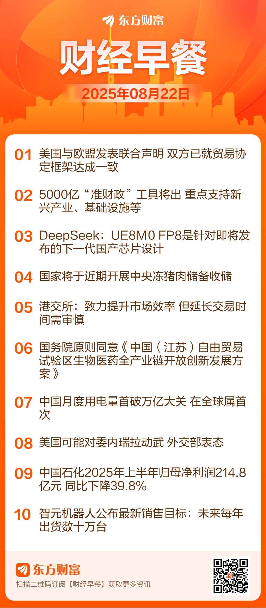![]() 每日精选国产芯片: DeepSeek在其官宣发布DeepSeek-V3.1的文章中提到,DeepSeek-V3.1使用了UE8M0 FP8 Scale的参数精度。另外,V3.1对分词器及chat template进行了较大调整,与DeepSeek-V3存在明显差异。DeepSeek官微在置顶留言里表示,UE8M0 FP8是针对即将发布的下一代国产芯片设计。 “准财政”工具: 自今年5月以来,多地围绕新型政策性金融工具开展政策宣讲会或者项目筹备会。近期,部分地方更是进一步梳理出入库项目清单,明确了申报基金的金额。从地方透露信息来看,新型政策性金融工具的资金规模为5000亿元,重点投向新兴产业、基础设施等领域,具体包括数字经济、人工智能、低空经济、消费领域、绿色低碳、农业农村、交通物流、城市基础设施等,国家开发银行、中国农业发展银行、中国进出口银行等政策性银行参与其中。 猪肉: 国家发改委官网公告,近期,由于夏季天气炎热、消费季节性偏弱,加之前期二次育肥生猪出栏,猪肉市场供应有所增加,生猪价格小幅回落。据国家发展改革委监测,近日全国平均猪粮比价跌至6∶1以下,按照《完善政府猪肉储备调节机制做好猪肉市场保供稳价工作预案》规定,进入三级预警区间。为促进生猪市场平稳运行,近期国家发展改革委将会同有关部门开展中央冻猪肉储备收储。 港股延长交易时间: 在港交所2025年中期业绩会上,有市场人士建议延长交易时间,港交所行政总裁陈翊庭的回答被部分市场人士误解为“港交所在研究24小时交易机制”。据港交所方面,陈翊庭表示,港交所一直致力于为投资者提供更多便利,对于所有相关的建议都持开放态度,但是因为延长交易时间对市场整体影响很大,挑战不小,需要非常审慎,也需要征求所有市场参与者的意见。例如,万一出错,现在尚有几小时可以修补问题,如果24小时不间断交易,就没有余地了。 美欧贸易协定: 美国白宫发表与欧盟的联合声明称,美国与欧盟已就一项贸易协定的框架达成一致。欧盟方面随后也发表了联合声明。根据白宫公布的声明,美国与欧盟的这项贸易协议的框架内容要点有19项,涵盖农产品、汽车、飞机等工业品、芯片半导体、能源、欧盟对美投资、放宽环境保护法规限制、网络安全协议、数字贸易壁垒等多方面内容。 国际石油贸易: 俄罗斯驻新德里大使馆官员表示,尽管美国发出警告,但俄罗斯方面仍计划继续向印度供应石油。印度驻俄罗斯大使也确认道,尽管面临美国的压力,新德里仍将继续购买俄罗斯石油。 美国可能对委内瑞拉动武 8月21日,外交部发言人毛宁主持例行记者会,有记者问:美国军舰在加勒比海岸巡逻,并且可能以打击毒品为借口动用武力。拉美和加勒比地区的各国领导人已对此举表示谴责,称其有违区域和平与安全。请问发言人有何评论?发言人毛宁表示,中方反对任何违反联合国宪章宗旨和原则、侵犯别国主权安全的行为。我们反对在国际关系中使用或威胁使用武力,反对外部势力以任何借口干涉委内瑞拉内政,希望美方多做有利于拉美和加勒比地区和平与安全的事情。 热点题材电力: 国家能源局对外发布了7月全社会用电量,达1.02万亿千瓦时,同比增长8.6%。比十年前翻了一番,相当于东盟国家全年的用电量。全社会用电量7月历史性突破万亿千瓦时大关,这在全球也属首次。 创新药: 国务院原则同意《中国(江苏)自由贸易试验区生物医药全产业链开放创新发展方案》。国务院在批复中表示,加快构建新发展格局,扎实推动高质量发展,更好统筹发展和安全,以高水平开放为引领、以制度创新为核心,开展首创性、集成式探索,推动生物医药全产业链集成创新发展,将中国(江苏)自由贸易试验区打造成为具有世界影响力的生物医药产业集聚地、更具国际竞争力的生物医药创新发展高地。 清洁能源: 当地时间8月20日,美国总统特朗普表示,他的政府将不会再批准风能或破坏农田的太阳能项目。特朗普当天在社交媒体上发文将风力和太阳能发电称为“本世纪的骗局”,并声称“任何建造并依赖风力发电和太阳能发电的州其电力和能源成本都出现了创纪录的增长。” 人工智能: 安徽省人民政府印发《打造通用人工智能产业创新和应用高地若干政策(2.0版)》,其中提出了9条具体政策举措,加速大模型等人工智能技术赋能千行百业,推动安徽省率先进入通用人工智能时代。 人形机器人: 智元机器人在其首届合作伙伴大会上透露,今年出货量预计可达数千台,明年预计会有数万台的出货。未来几年,该公司希望每年出货量可达到数十万台。该公司还发布了最新产品灵犀X2-W,同时,智元启动了首个专注具身智能产业链的创业加速计划——“智元A计划”。该计划旨在孵化50+高潜力早期项目,在三年内打造千亿级产业生态。 AI医疗: 近日,国家卫生健康委等四部门联合印发了《关于推进耳与听力健康工作的指导意见》。《指导意见》提出,支持耳与听力领域前沿技术发展与转化。推动数据信息、人工智能技术在耳与听力健康领域的应用。 可燃冰: 近日,海南大学海洋清洁能源创新团队成功破解了长期制约的世界性难题,在甲烷直接催化转化领域取得颠覆性突破。该团队研发的新型催化体系,以接近100%的完美选择性,在温和条件下将气态的甲烷高效转化为高附加值的液体燃料甲醇,为我国南海丰富的天然气水合物资源就地转化、高效利用提供了具有自主知识产权的
