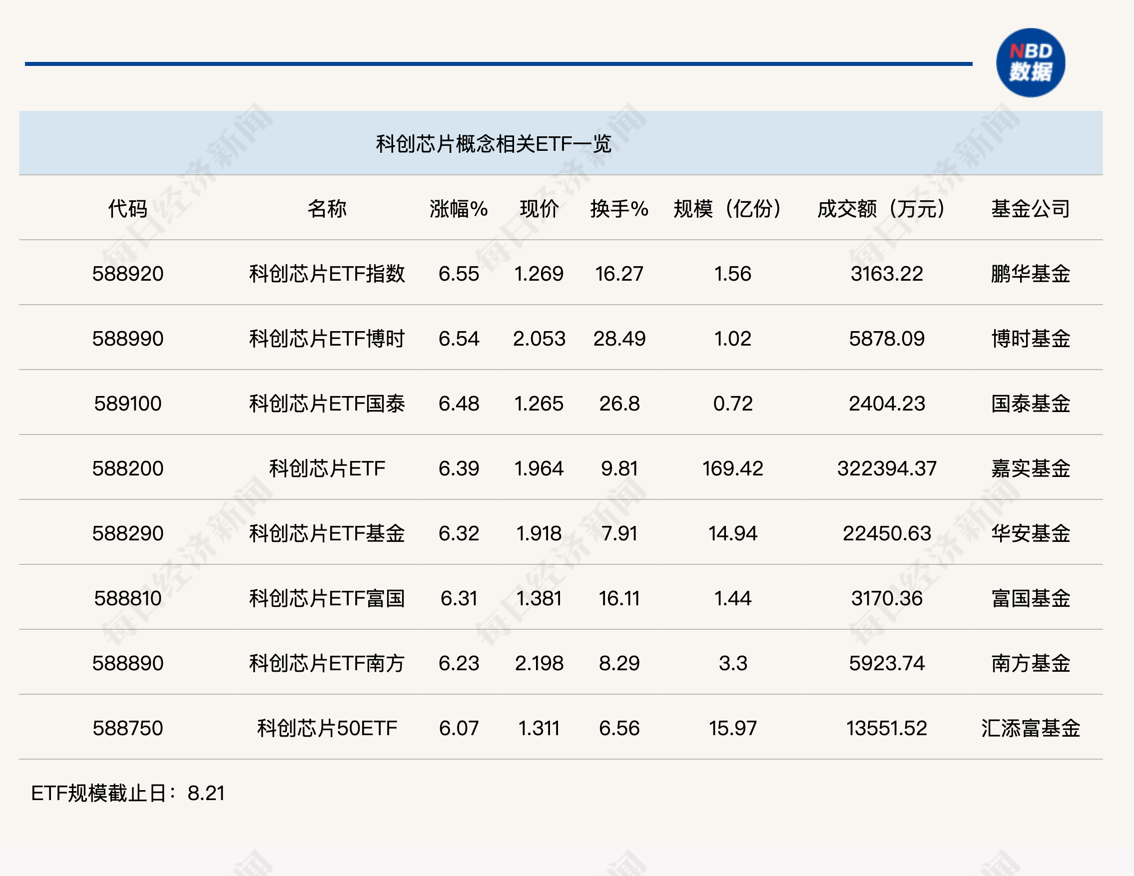 每经编辑|肖芮冬 今日,半导体产业链全线爆发,寒武纪股价大涨12%,中芯国际盘中涨幅也超10%,这也带动科创芯片指数走高。ETF市场方面,科创芯片ETF指数(588920)等8只科创芯片相关ETF半日涨幅均超过6% ...