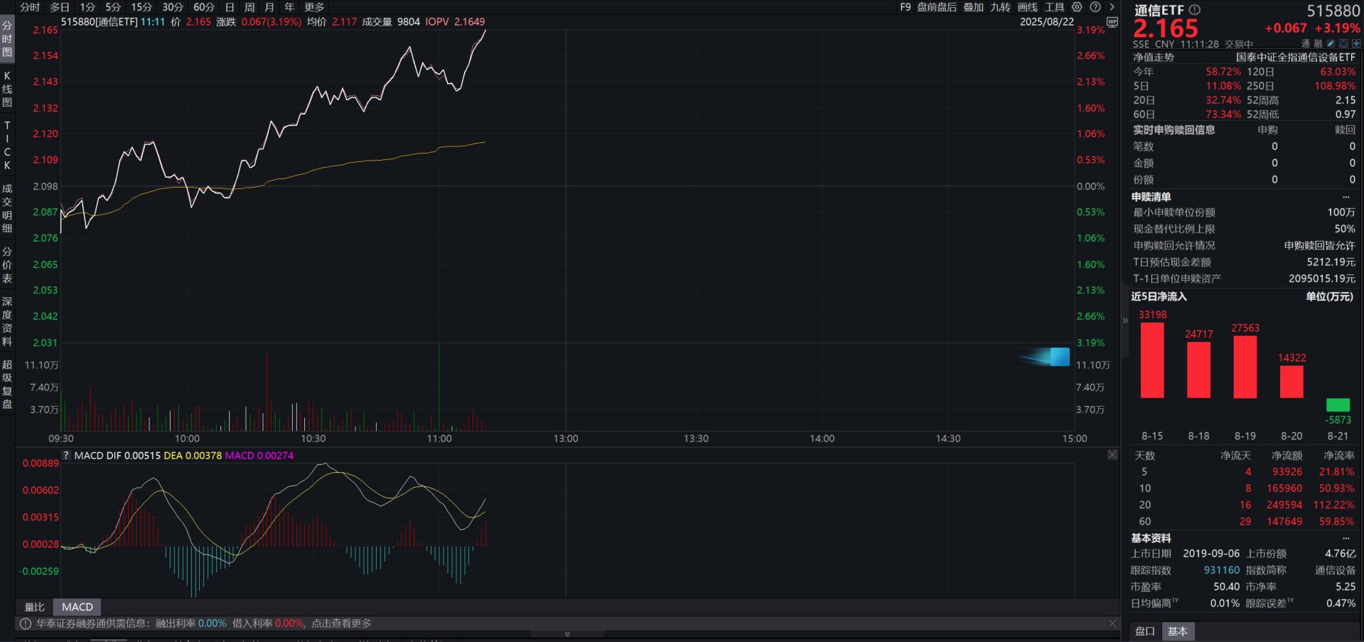 每经编辑|赵云 8月22日早盘,人工智能概念催化,光模块产业链持续放量大涨,通信ETF(SH515880)涨幅超3%,价格再创新高,资金火热布局,近10日吸金超16亿元。 AI大模型加速迭代,光模块景气向好 ...