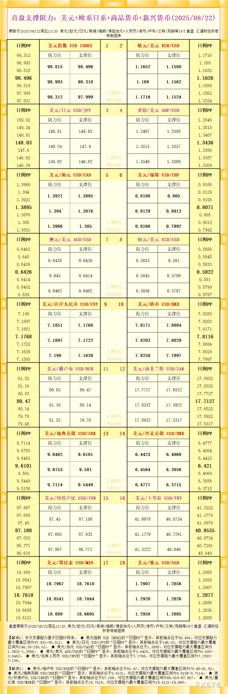 一张图看直盘支撑阻力 美元 欧系日系 商品货币 新兴货币 更新于2025年8月22日周五13 30 具体美元 欧元 日元 英镑 瑞郎 澳纽加元 人民币 港币 卢布 兰特 克朗等18个直盘 更多详见汇通财经析若特制图表中的内容 如图数 ...