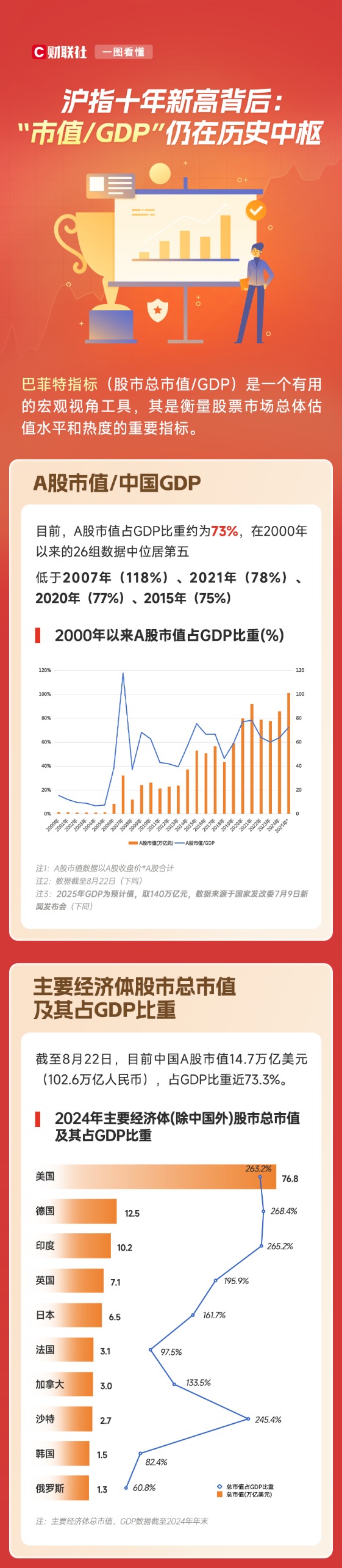 目前,A股市场交投持续“火爆”,2万亿量能行情成常态,沪指等多个市场指数今日续刷新高。不过,若以巴菲特指标(市值/GDP)统计,A股目前证券化率近73%,仍处于近十年中枢(60%-80%)区间,并大幅低于其余全球 ...