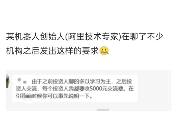 每经记者|李蕾 每经编辑|赵云 机器人赛道火爆到什么程度?连企业创始人都开始“反向”向投资人收交流费了。 《每日经济新闻》获悉,近日某机器人企业创始人的聊天截图在业内广泛流传。该创始人表示:“由于之前投资人聊的多以学习为主,之后投资人交流,每人都要收5000元交流费。” 此情此景,让人想起前不久的一则业内消息:某热门赛道创始人因为频繁接待前来调研的VC机构,不堪其扰之下提出了“来尽调得先支付误工费”的要求。而在2023年,深圳一家科技公司曾在官网挂出一份说明,投资人要先付1000万元才可做尽调,被大家戏称为“史上最强创业者”。 究其背景,一方面是机器人赛道的持续火热,明星公司可谓被投资机构“踏破门槛”。根据CVSource投中数据,截至8月22日机器人领域的投资事件已超过340起,几乎与去年全年的投资数量持平。另一方面,也折射出一级市场热门赛道内卷趋于白热化、优质项目却愈发稀缺的矛盾。 网传截图:投资人先交5000元交流费再谈想和热门企业创始人交流?先交5000元,哪怕你是投资人。 最近,一则某机器人企业创始人的聊天记录截图在创投圈流传。其表示,由于之前与投资人的交流多以学习为主,之后再与投资人交流,要向每个投资人收取5000元交流费。 此言一出,引起不少创业者共鸣的同时,也招来了一些争议。有机构人士评论,也算见了不少创始人,这样的要求还是第一次见,“这是还没有见识资本市场的险恶”。 对投资人“反向收费”的操作虽然新奇,不过倒也有类似先例。前段时间投资圈还有一则消息也传播甚广——某热门赛道创始人因频繁接待前来调研的投资机构,提出了“来尽调得先支付误工费”的要求,并且把自己这通操作称为“反向投资模式”,颇有些商业模式创新的意味。 再往前,2023年深圳领存技术在官网挂出一份说明,投资人要先付1000万元才可做尽调,也是直接火出圈。 值得一提的是,在引起广泛关注后,领存技术其实还发了第二份声明,里面有几点内容也挺有意思。公司表示,首先,因项目需要募集的金额比较大,真正有钱的机构并不多,大多数都是了解一下或者是为了投同行而从创始人这里套取一些信息,这会浪费创始人很多时间;第二,不敢遑论“融资模式创新”,只是基于实际需求制定了自己的规则,实际的结果是大幅提升了融资效率,创始人有效的时间用于工厂建设和内部管理,在领存这是成功的经验。 这与上述机器人创始人的想法或许有些异曲同工:不是所有机构都是抱着投资目的来的,有人只是为了解一下,有人对行业和企业并不了解只是想来学习,还有人干脆就是来套取信息甚至商业机密的。不论是5000元、1000万还是误工费,都是企业为了提高效率而设置的门槛。 有VC人士对每经记者表示,这其实是一种双向选择:“归根到底,还是这些企业热门,机构才会去主动接触,那人家也有权利决定是不是接受你的尽调。” 机器人赛道投资已与去年全年持平