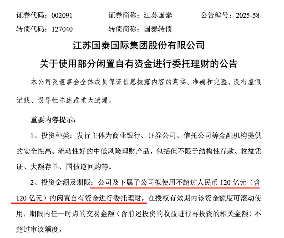 最新公告显示,总市值124亿元的A股公司江苏国泰(002091),拟使用不超过120亿元委托理财、不超18.3亿元进行证券投资,二者合计超过138亿元。 江苏国泰8月22日晚间披露多份公告,其中提及公司最新的理财投资计 ...
