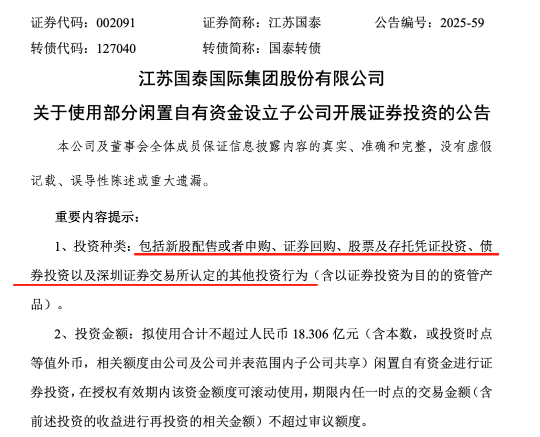 最新公告显示,总市值124亿元的A股公司江苏国泰(002091),拟使用不超过120亿元委托理财、不超18.3亿元进行证券投资,二者合计超过138亿元。 ![]() 江苏国泰8月22日晚间披露多份公告,其中提及公司最新的理财投资计划。 公告显示,为提高公司及合并范围内子公司存量资金的使用效率与效益,在保障日常生产经营资金需求以及不影响正常经营的情况下,公司及下属公司拟使用闲置自有资金进行适度证券投资。 江苏国泰及下属公司拟使用合计不超过人民币18.306亿元(含本数,或投资时点等值外币)闲置自有资金进行证券投资。 其中,截至目前,江苏国泰及下属公司证券投资已投入人民币3.306亿元;公司下属公司紫金科技拟以自有资金15亿元投资设立子公司张家港市鼎瑞投资有限公司,开展证券投资业务。 其拟投资方式包括新股配售或者申购、证券回购、股票及存托凭证投资等,额度在授权有效期内循环使用。 ![]() 8月22日晚,江苏国泰同时宣布,为进一步提高资金使用效率,公司及下属子公司拟继续合理使用部分闲置自有资金进行委托理财,增加投资收益,为公司及股东获取更多的投资回报。 根据目前的资金状况和使用计划,江苏国泰及下属子公司拟使用不超过120亿元的闲置自有资金进行委托理财,每笔委托理财的投资期限不超过36个月。 ![]() 江苏国泰表示,将对理财产品进行严格评估、筛选,选择安全性高、流动性好的中低风险理财产品,包括但不限于结构性存款、收益凭证、大额存单、国债逆回购等。 江苏国泰是一家主要从事供应链服务和化工新能源业务的上市公司。最新披露的2025年半年报显示,上半年公司实现营业收入185.97亿元,同比增长5.48%;归母净利润为5.45亿元,同比增长10.85%;公司期末货币资金余额达到125.7亿元,其中银行存款114.87亿元。 8月22日晚,江苏国泰另公告,因外部客观条件及行业环境变化,公司下属公司宁德国泰华荣新材料有限公司拟终止投资建设年产40万吨锂离子电池电解液项目,该项目尚未正式投入建设,目前正在与政府积极协调土地的后续工作。 2021年12月11日,江苏国泰审议通过了《关于投资建设年产40万吨锂离子电池电解液项目暨对下属公司增资的议案》,下属公司宁德华荣拟投资建设年产40万吨锂离子电池电解液项目,项目总投资15.4亿元。 江苏国泰表示,从行业层面来看,近年来锂电池材料领域产能扩张显著快于市场需求增长,产能阶段性过剩,市场竞争激烈,电解液产品价格持续下行,行业盈利空间受到大幅压缩,预计该项目产能难以消化,投资回报率大幅下降,难以实现原计划效益目标,公司经审慎研究决定终止增资建设该项目。 (文章来源:证券时报网) |