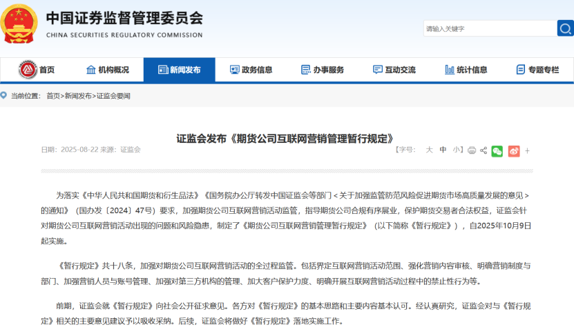 8月22日,中国证监会公告称,针对期货公司互联网营销活动出现的问题和风险隐患,证监会制定《期货公司互联网营销管理暂行规定》(以下简称《暂行规定》),自2025年10月9日起实施。 规范期货公司互联网营销活 ...