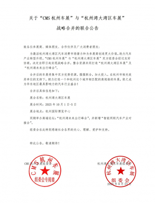 致各位参展商、媒体朋友、合作伙伴及广大消费者朋友: 为激活杭州湾大湾区汽车消费市场潜力和为参展商创造更大价值,助力汽车产业转型升级。“CMS杭州车展”与“杭州湾大湾区车展”双方组委会经过友好协商,决定自即日起实现战略合并,整合资源共同打造“杭州湾大湾区车展”及“杭州湾未来出行峰会”。 合并后的车展将集中双方优势资源,强强联合,加大投入,在杭州市相关政府单位的支持下,倾力打造一个和杭州这个城市相匹配的高规格的车展,使之成为华东地区最具影响力的汽车行业盛会! 合并后具体信息如下: 展会名称:杭州湾大湾区车展 展会时间:2025年10月1日-5日 展会地点:杭州国际博览中心 同期举办高端论坛:“杭州湾未来出行峰会”,并新增“智能网联汽车产业对接会”。 组委会在此特别感谢社会各界的关心、理解、爱护和支持。 特此公告,敬请期待! CMS杭州车展组委会 杭州湾大湾区车展组委会 2025年8月23日