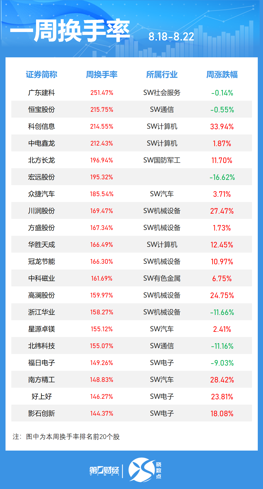 本周(8月18日-8月22日)三大指数均上涨,沪指本周累计涨3.49%,深证成指涨4.57%,创业板指涨5.85%。 ![]() 牛熊股:9股周涨超50%,两股周涨超60% Wind数据显示,本周(8月18日至8月22日)共有11只个股涨幅超40%,2只个股涨超60%。 科森科技本周涨幅居首,周涨幅达61.14%。园林股份、震安科技、御银股份周涨幅居前,分别为61.09%、53.11%、46.20%。 跌幅榜中,本周14只个股跌幅超15%,*ST高鸿周跌22.67%居首,力诺药包、速达股份跌幅分别为22.05%、19.33%。 ![]() 活跃个股:94股累计换手率超100% 本周共有94只个股换手率超过100%。其中,广东建科排名居首,周换手率达到251.47%,恒宝股份周换手率215.75%,科创信息周换手率214.55%。 按照申万一级行业分类看,本周换手率100%以上的个股中,所属机械设备、电子、计算机等行业的个股居多。 从一周涨跌幅来看,本周换手率超过100%的个股中,御银股份、科创信息、中科金财涨幅居前。 ![]() 主力资金:机械设备板块遭抛售超180亿中兴通讯获加仓居首 按申万一级行业来看,本周(8月18日至8月22日)五个交易日内,通信、综合、传媒板块获主力资金净流入,机械设备、医药生物、电力设备、计算机、非银金融、有色金属等板块遭净流出额居前。其中机械设备板块遭抛售超180亿元。 个股方面,本周中兴通讯获净流入70.19亿元居首,周涨幅32.21%。中油资本、昆仑万维、御银股份主力净流入分别为12.86亿元、11.66亿元、10.39亿元。净流出方面,东方财富、胜宏科技、英维克分别遭抛售39.68亿元、27.66亿元、21.83亿元。 ![]() 杠杆资金:中芯国际获融资买入额居首 Wind统计显示,本周(8月18日至8月22日)共有2374只个股获融资净买入,净买入金额在千万元以上的有1459只,共有245只融资净买入额超1亿元。 中芯国际本周获融资净买入居首,净买入额为18.69亿元,周涨幅达13.21%。寒武纪-U、中际旭创、北方稀土获净买入额居前;宁德时代、盛和资源、潞安环能遭净卖出额居前,金额分别为4.56亿元、2.84亿元、2.39亿元。 ![]() 机构调研个股:德赛西威获228家机构关注 Wind数据显示,机构本周(8月18日至8月22日)共调研了170家上市公司,其中德赛西威最获关注,参与调研的机构达228家。水晶光电获226家机构调研。开立医疗、云天化、若羽臣获超160家机构调研。 据统计,冰轮环境获机构调研5次,友发集团获调研4次,热威股份、正海磁材、洁美科技、美盈森获调研3次。 从调研行业来看,机构持续聚焦工业机械、电子元件、电气部件与设备等板块。 机构本周首次青睐91只个股 Wind数据显示,机构本周首次关注91只个股,其中8股被给予目标价。 -新强联获华泰证券给予“增持”评级,目标价为42.00元,该股最新收盘价为36.88元; -宁波精达获太平洋证券“买入”评级,目标价为12.82元,最新收盘价为10.70元; -飞亚达获东北证券给予“买入”评级,目标价为23.07元,该股最新收盘价为18.82元; -中孚实业、妙可蓝多、工业富联等股本周均获机构首次关注。 ![]() (文章来源:第一财经) |