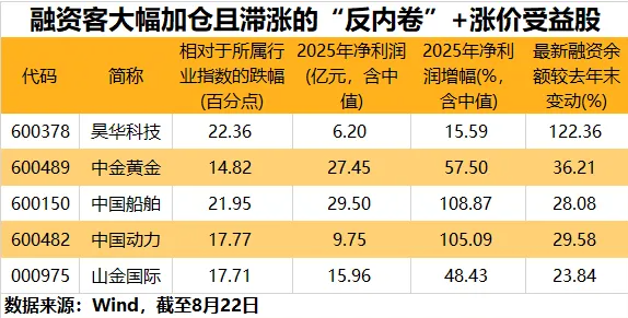 今年以来,国内“反内卷”行动持续推进,建立统一大市场的战略部署稳步实施。在此背景下,去库存、稳增长成为国内市场运行的主旋律。这一趋势成效渐显,不少公司借助价格回升的东风,在“反内卷”带来的良性竞争环境中,今年上半年业绩或迎反转摆脱困境,或持续增长凸显成长能力。 多重利好共振 中材科技强势涨停 8月21日晚,中材科技发布半年报,今年上半年实现净利润9.99亿元,同比增长114.92%。根据此前披露的业绩预告,上半年玻璃纤维产品结构优化、价格同比上升是公司业绩增长的重要原因之一。 公司曾于去年在互动易披露,其自主研发的应用于高端PCB的第一代低介电产品获得国内知名客户“PCB多元化项目技术突破奖”,已量产量供。 可见,受益于自身重磅产品价格上涨,以及上下游行业景气度的提升,中材科技上半年净利润增速创近10年同期最高水平,并且于发布半年报的次日(8月22日)强势涨停。 “反内卷”缓解无序竞争 事实上,国内“反内卷”行动持续推行,叠加行业景气度的提升,国内诸多产品迎来涨价潮,包括PCB产业链上游环节的覆铜板(CCL)行业、钛白粉企业。在业内人士看来,覆铜板的涨价主要受原材料成本攀升及下游需求激增的双重驱动,标志着PCB行业进入新一轮景气周期。 根据生意社数据,甲苯二异氰酸酯(TDI)、三氯甲烷、磷酸锂、氧化钕等大宗商品7月末价格较月初涨幅均超过15%。另外,根据百川盈孚数据,截至8月21日,稀土主要品种氧化镨报价65.75万元/吨,相比月初上涨11万元/吨,涨幅超20%,年内涨幅超58%。 申万宏源表示,“反内卷”政策推动企业从单纯的价格竞争转向技术、品质竞争,加速产业升级。企业通过加大研发投入、提升产品品质与服务水平,增加产品附加值,进而有能力提高产品价格。在一些高端制造业领域,企业在“反内卷”环境下,聚焦技术创新,产品差异化程度提升,得以摆脱低价竞争困境,实现产品价格与利润的双提升。 ![]() 截图来源:生意社 “反内卷”+涨价受益股出炉 据证券时报·数据宝不完全统计,截至8月22日,披露2025年半年报预告的1600余只个股中,根据业绩变动原因,受益于“反内卷”行动或价格上涨,今年上半年业绩向好(包含净利润增长、扭亏为盈)的个股有64只(下称“反内卷”+涨价受益股)。 从行业分布来看,上述64只个股分布于13个行业,集中分布于基础化工、有色金属、建筑材料行业,这3个行业各有21只、19只、5只。 从业绩来看(业绩预告按中值计算),这13个行业中,2025年上半年净利润同比增长的行业达9个,包括基础化工、农林牧渔、环保等。其中,农林牧渔行业公司整体今年上半年净利润增幅超过820%,去年同期则低于100%。 ![]() 数据来源:Wind 具体到单只个股来看,2025年上半年业绩增长的有54只,其余10只上半年业绩扭亏。 福建水泥上半年业绩扭亏,报告期内,公司积极落实错峰生产,响应和推动行业“反内卷”协同,加强精准营销,实现水泥平均售价同比上涨和商品销量略有增加。 华新水泥积极响应“反内卷”“稳增长”的倡议,践行“利润是目标,价格(收入)是基础”的理念,水泥产品平均售价同比上涨,2025年上半年净利润增幅中值超过50%,扭转过去3年同期净利润持续下滑的局面。 另外,华宏科技、先达股份、索通发展、苏利股份今年上半年净利润增幅(含增幅中值)均超过10倍。其中,华宏科技上半年净利润增幅中值接近34倍,增幅排在64只个股首位,主要系公司上一年同期净利润基础较低所致。公司表示,业绩增长主要得益于国内主要稀土原料产品价格在国家产业政策支持、市场供需格局改善及国际贸易环境变化推动下企稳回升。公司依托在稀土资源综合利用领域的技术积累与运营优势,有效把握市场机遇,推动稀土资源综合利用板块呈现良好发展势头。 超四成个股年内股价涨幅超过50% 从市场表现来看,截至8月22日,上述64只个股年内平均涨幅接近52%,27只个股涨幅超过50%,个股数量占比超四成,其中有7只个股股价翻倍。 ![]() 中毅达年内涨幅超过220%,公司上半年业绩扭亏,报告期内,受市场情况影响,公司核心产品季戊四醇系列产品价格逐步回升推动毛利率上升,使得净利润同比增长。 利民股份年内股价涨幅近170%,上半年净利润增幅超过740%,业绩较上年同期上升主要原因系,公司主要产品销量和价格同比上涨、毛利率提升以及参股公司业绩上涨带来投资收益增加。 另外,上半年扭亏股盛和资源、广晟有色年内股价涨幅均超过130%,扭亏原因均包括稀土主要产品价格录得同比上涨,公司加大生产规模。 融资客大幅加仓的滞涨股仅5只 上述64只个股中,有52只属于融资融券标的,其中最新(8月21日)融资余额较去年末增加(含年内新进成为融资融券的标的)的个股数量占比近七成,共计36只。 30余只个股获融资客加仓超过10%,索通发展、福建水泥、中毅达等股获加仓超过100%。其中,索通发展最新融资余额7.65亿元,较去年末加仓超过275%;福建水泥获加仓超过195%。 结合行业来看,“反内卷”+涨价受益股中,截至8月22日,年内跑输所属的申万行业,且最新融资余额较去年末加仓幅度超过20%的个股仅有5只,按照加仓幅度排序,分别为昊华科技、中金黄金、中国船舶、中国动力、山金国际,其中昊华科技获融资客加仓超过120%。 中国船舶、中国动力今年上半年净利润增幅中值均超过100%,中金黄金上半年净利润增幅超过50%。 从市场表现