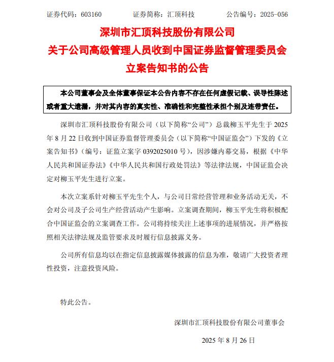 汇顶科技(603160.SH)公告称,公司总裁柳玉平于2025年8月22日收到中国证监会下发的《立案告知书》,因涉嫌内幕交易,中国证监会决定对柳玉平进行立案。本次立案系针对柳玉平个人,与公司日常经营管理和业务活动无 ...