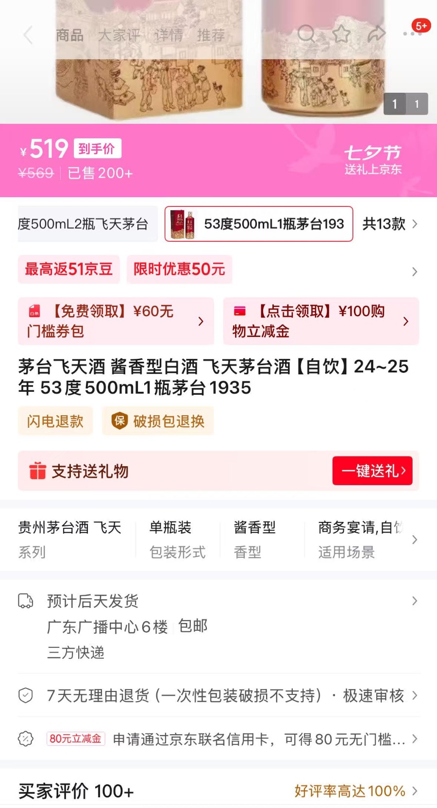 8月25日,投资快报记者注意到,茅台酱香酒在淘宝、京东的旗舰店推出茅台1935酒(高端)的预售,53度500ml价格为998元/瓶;其中,京东茅台酱香酒旗舰店显示已售48件。据业内人士消息,该产品预售期三天,将于8月2 ...