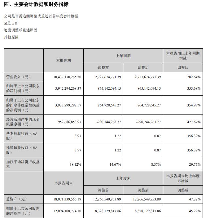 新易盛8月25日披露半年报,公司上半年实现营业收入104.37亿元,同比增长282.64%;归属于上市公司股东的净利润39.42亿元,上年同期8.65亿元,同比增长355.68%;基本每股收益3.97元。 ![]() (文章来源:界面新闻) |